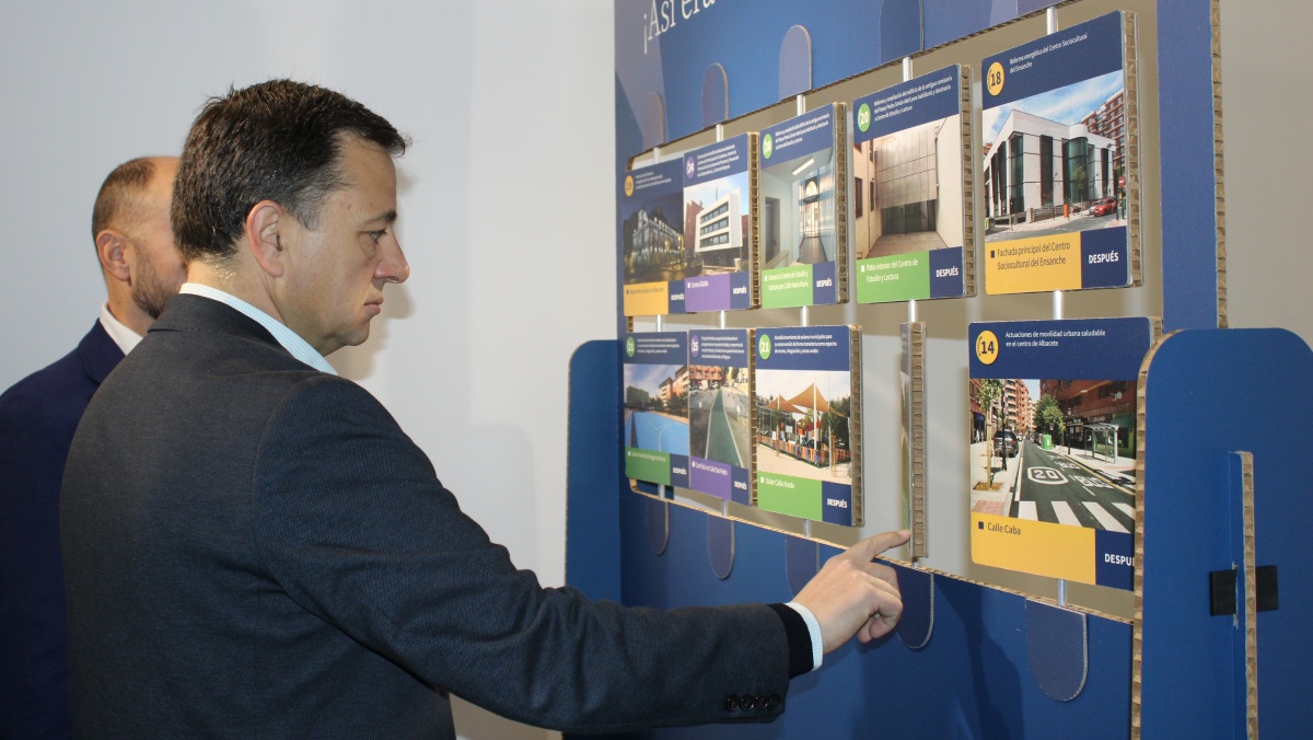 Manuel Serrano ha puesto en valor las 26 actuaciones que se han realizado en Albacete, entre las que por ejemplo se encuentra la rehabilitación del edificio que alberga esta exposición, siempre con el objetivo de avanzar hacia una ciudad “más inteligente, sostenible e integradora”, señalando que el total de gasto de EDUSI Albacete ha sido de 19,5 millones de euros, con una ayuda europea de 13,5 millones de euros, en el marco del Programa Operativo del Fondo Europeo de Desarrollo Regional 2014-2020 Plurirregional de España, y el resto aportado por el propio Ayuntamiento