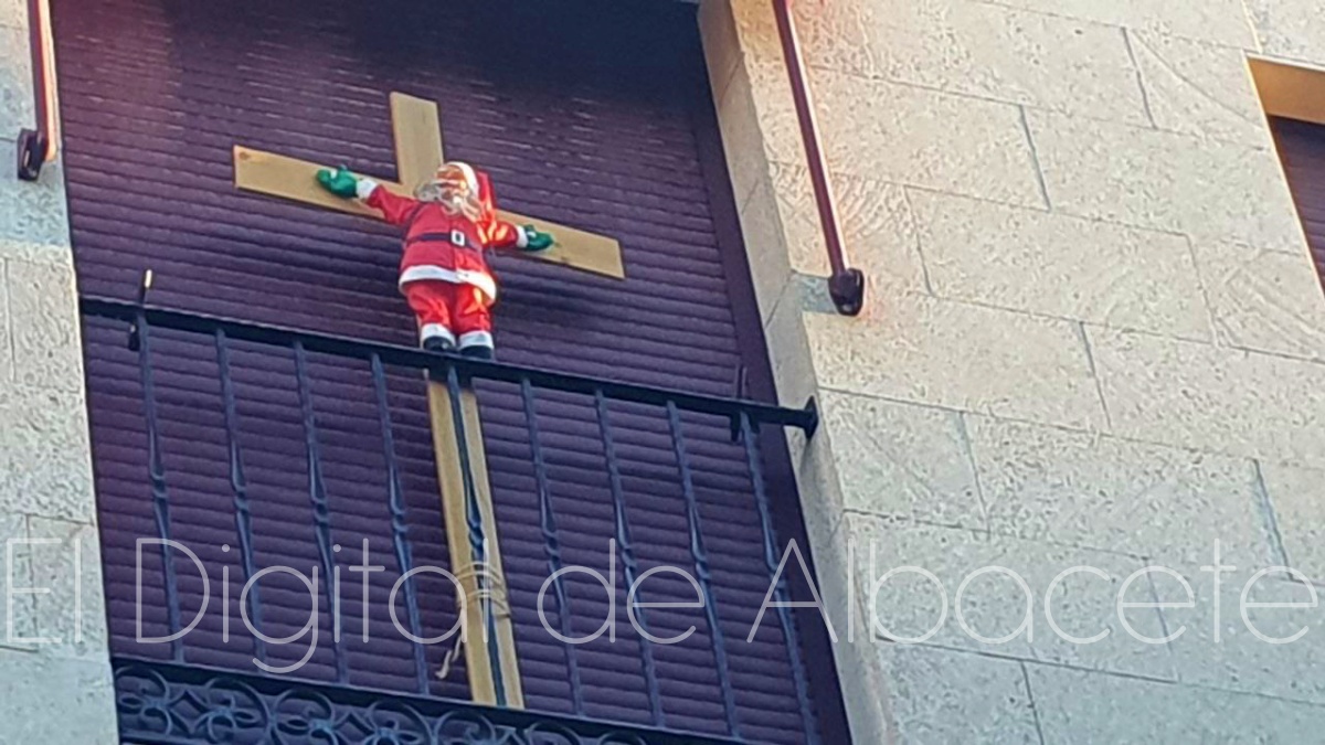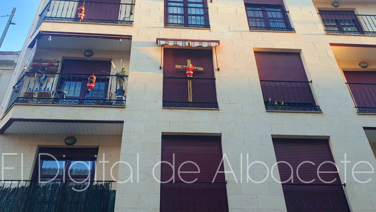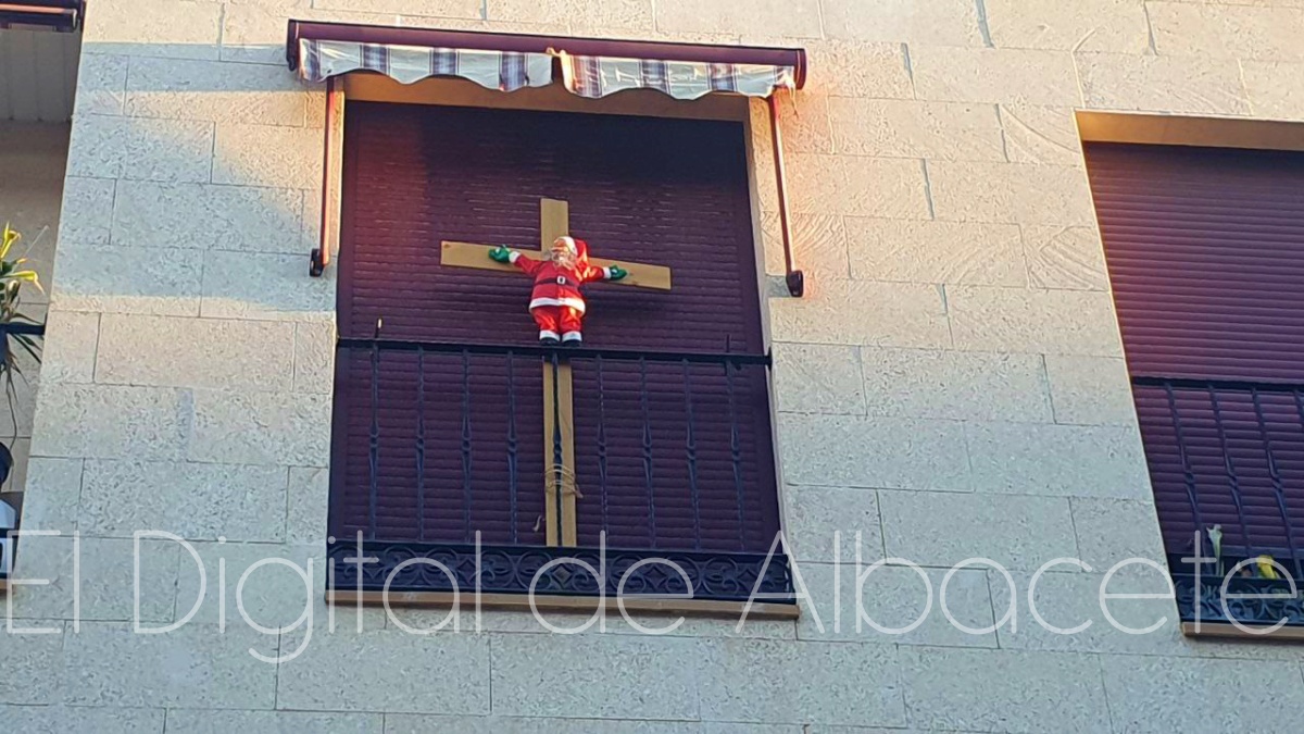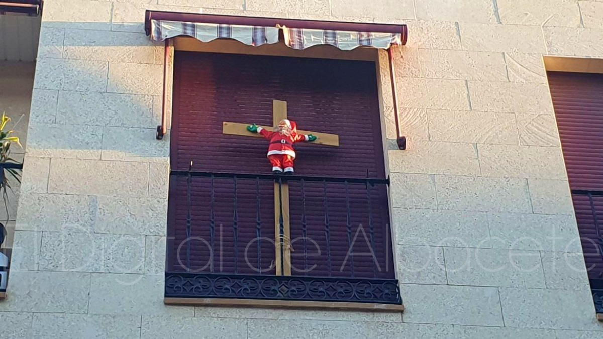Las fiestas navideñas están a la vuelta de la esquina y la decoración típica inunda calles, escaparates y domicilios de Albacete. Pero en la capital manchega también hay hueco para la decoración no tan típica, porque un Papá Noel crucificado deja perplejos a todos aquellos que pasan por la calle Luis Rosales y alzan la vista al ventanal donde un muñeco de Santa Claus se encuentra clavado en una cruz de madera de considerables dimensiones.