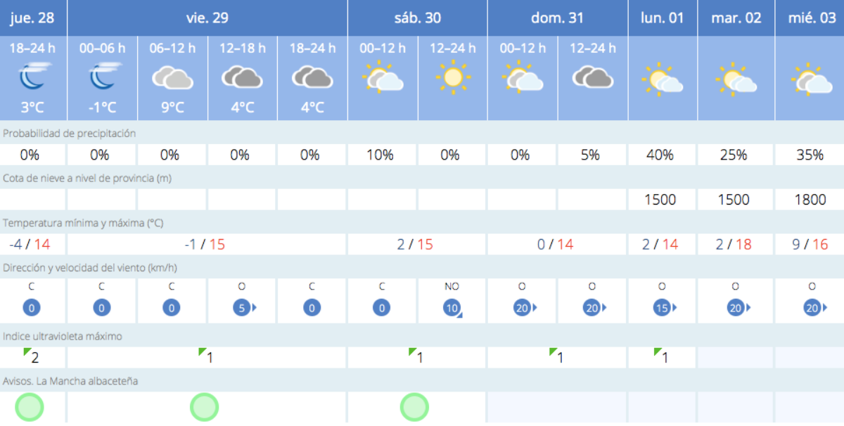 Las temperaturas oscilarán entre los -1 y los 15 grados en Albacete, entre los 0 y los 12 en Ciudad Real, entre -2 y 15 grados en Cuenca, entre -1 y 12 grados en Guadalajara y entre 0 y 13 grados en Toledo.