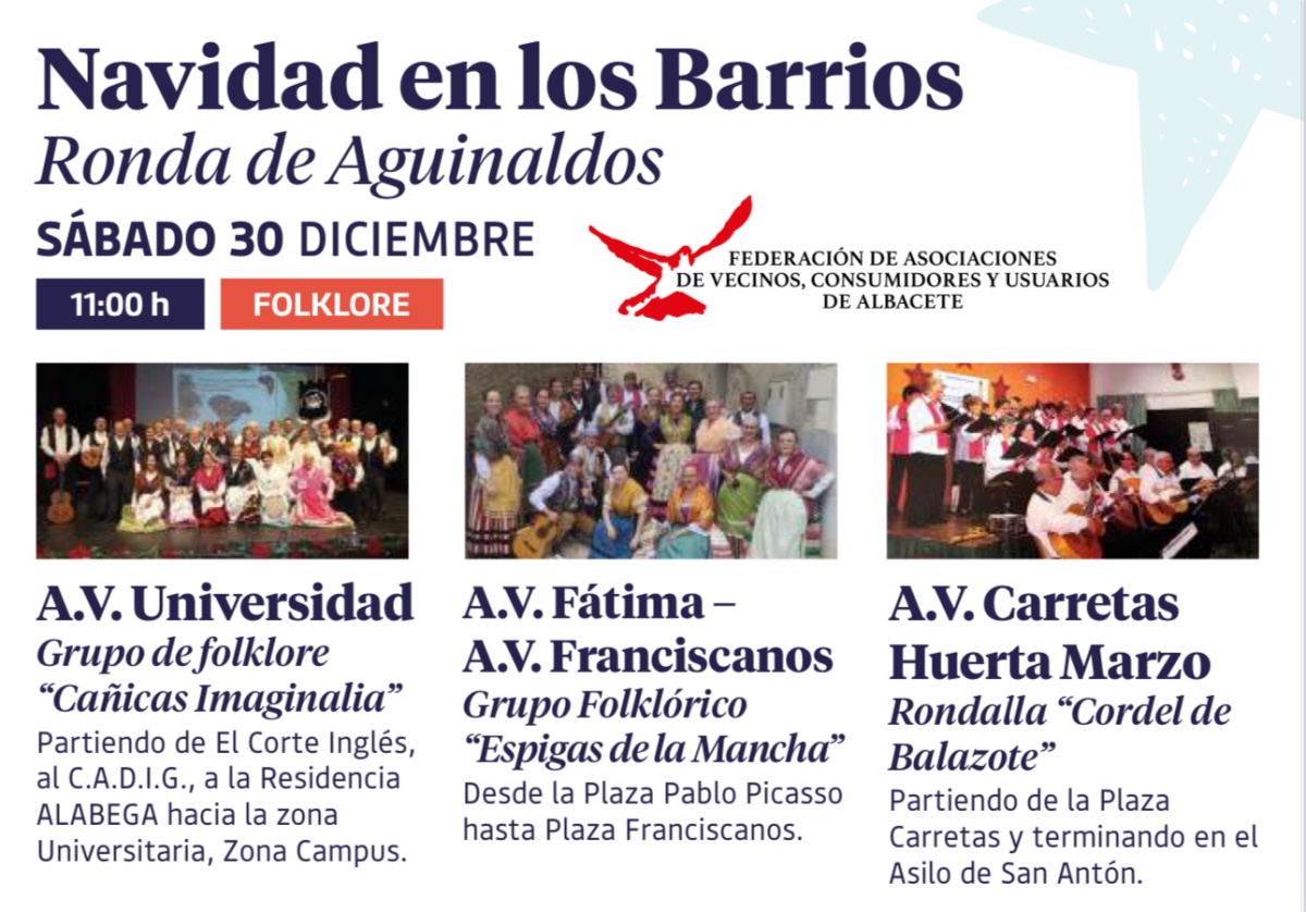 La Ronda de Aguinaldos simboliza la unión y la generosidad de nuestra comunidad durante la temporada festiva. La Federación de Asociaciones de Vecinos de Albacete, se enorgullece en organizar este evento con el objetivo de fomentar el espíritu navideño entre los residentes de Albacete.