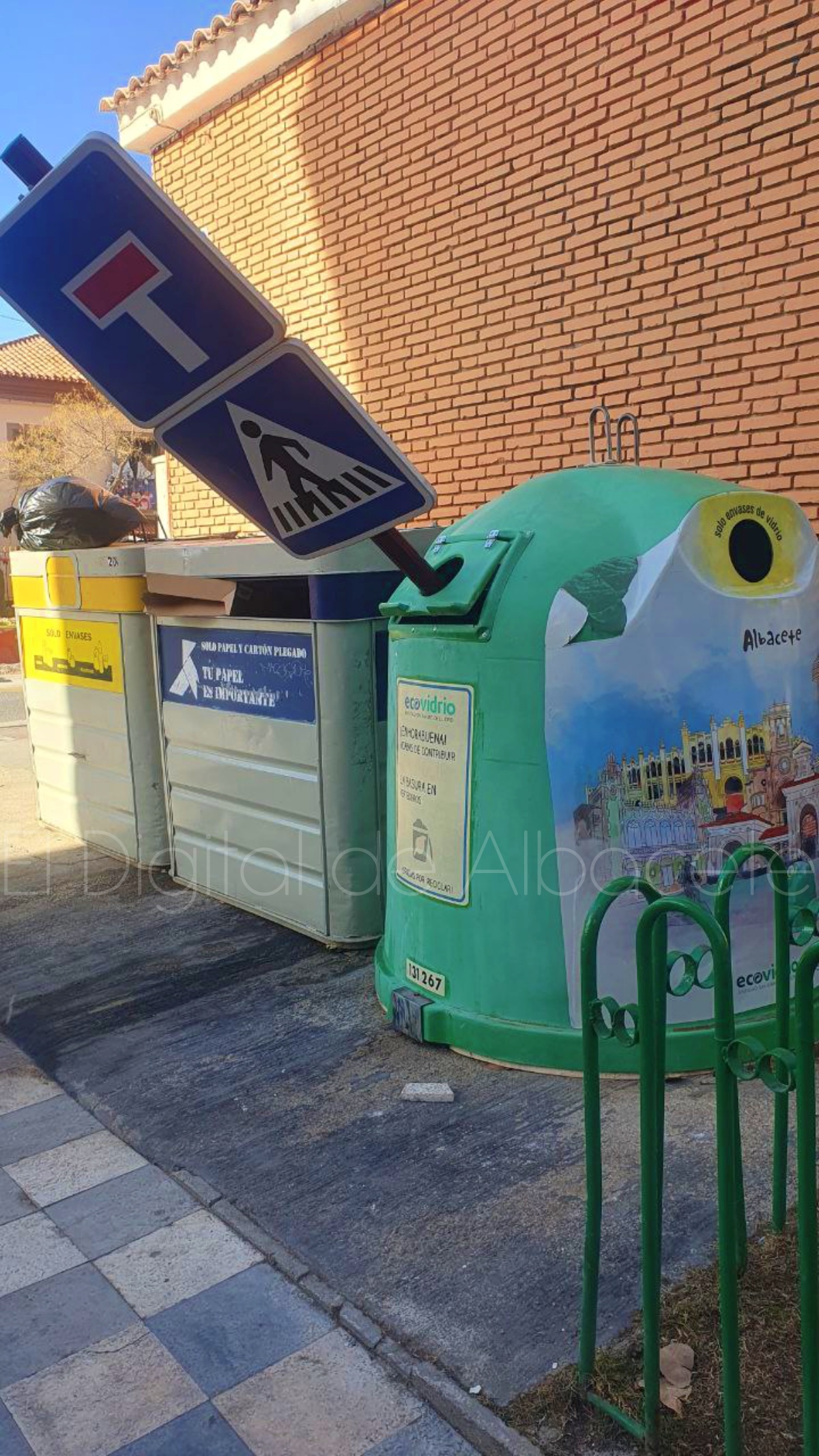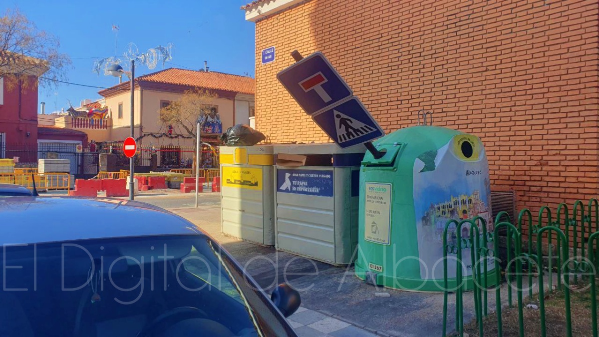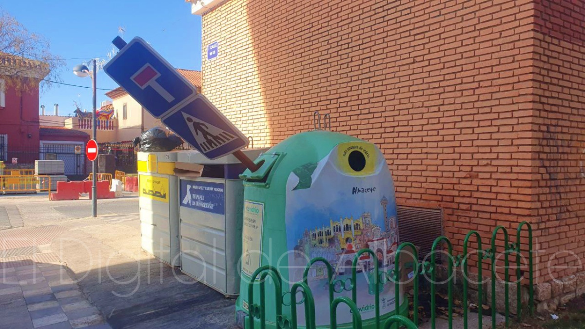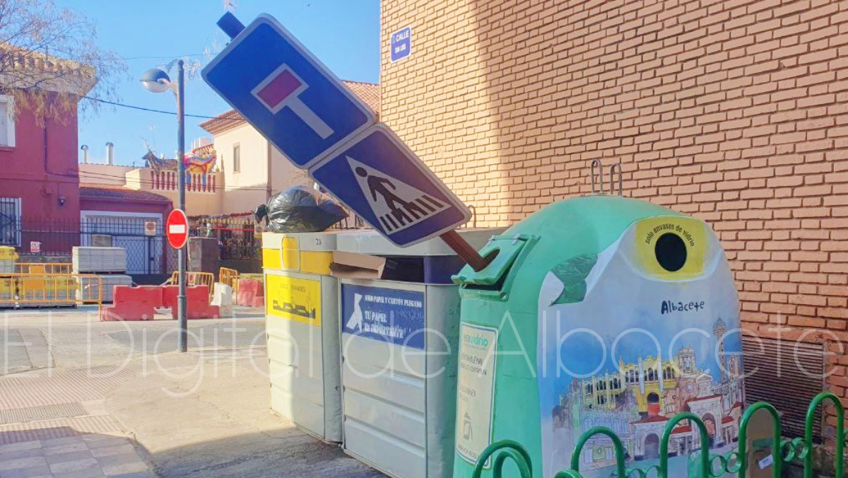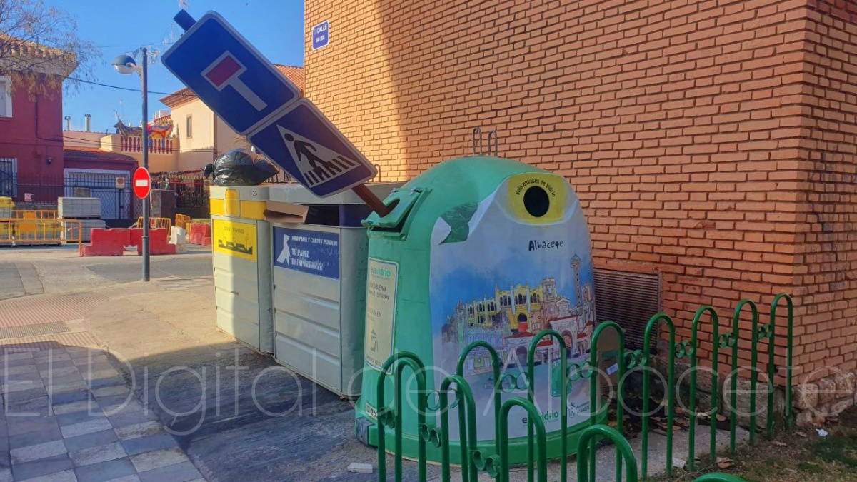 Fruto de estas actitudes se producen imágenes como las que acompaña esta información, en la que una señal que indicaba la presencia de una calle sin salida al tráfico rodado y la existencia de un paso de peatones apareció arrancada de cuajo de su ubicación e introducida en un contenedor de los destinados a recoger el vidrio que después será reciclado.