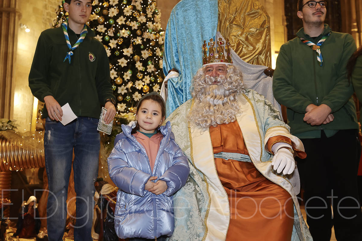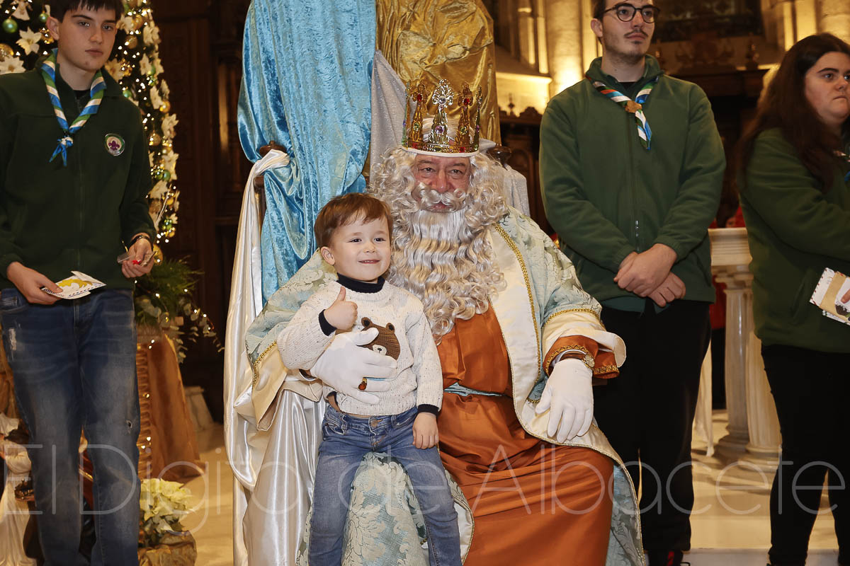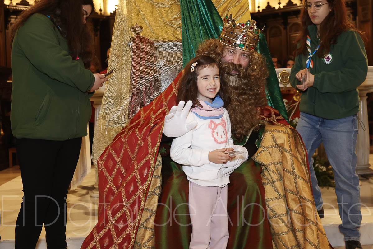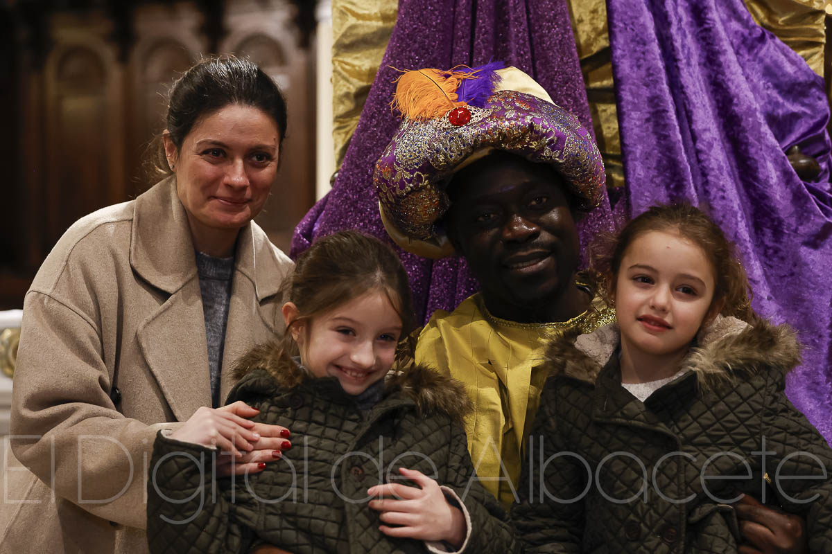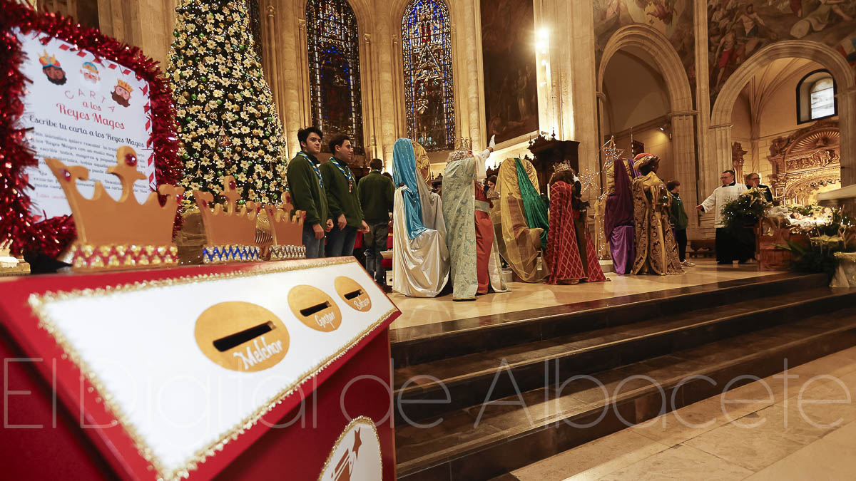 Los Reyes Magos de Oriente han visitado la Catedral de Albacete este miércoles, 3 de enero, una visita que han aprovechado para adorar al Niño Jesús junto a todos aquellos niños y niñas de Albacete que se han acercado al templo para acompañarlos y darles en persona las cartas en las que piden sus regalos y deseos.