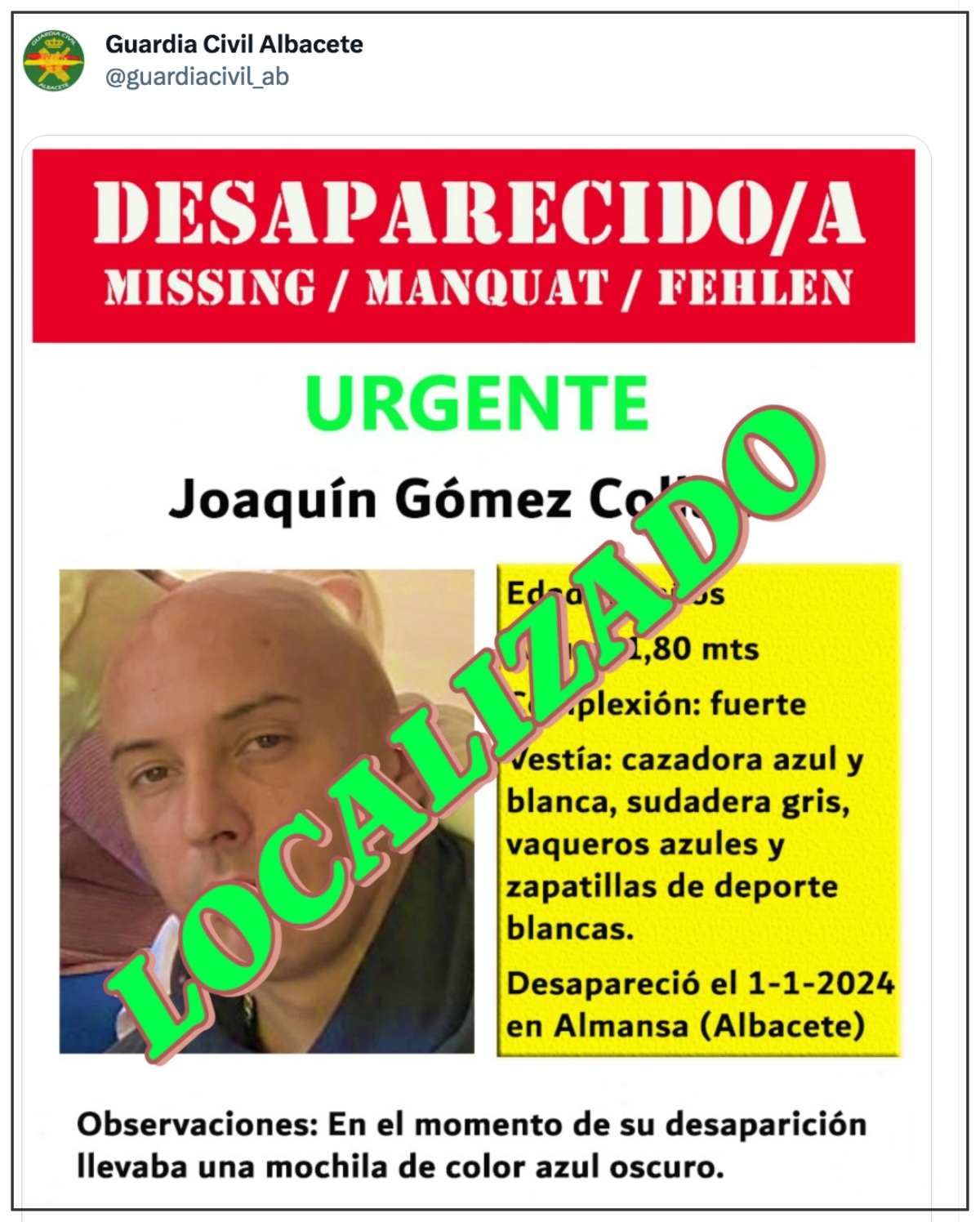Gracias a la colaboración ciudadana y a la labor de los agentes de la Benemérita, el paradero de Joaquín ha sido descubierto y se ha dado por tanto por finalizada su desaparición.