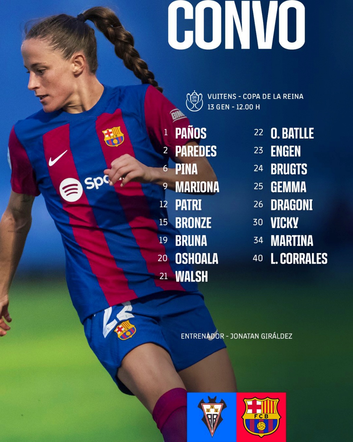 El equipo azulgrana visita Albacete sin Aitana Bonmatí, Graham y Sandra Paralluelo, por decisión técnica, y respecto al último partido de Liga tampoco estará Marta, con un esguince en el tobillo. Giráldez ha citado a un total de 17 futbolistas para el partido. La que también es baja es Alexia Putellas, que el 27 de diciembre fue sometida a una artroscopia de revisión en su rodilla izquierda por el doctor Joan Carles Monllau, bajo la supervisión de los Servicios Médicos del Club, en el Hospital de Barcelona. Por el momento la que fuera Balón de Oro es baja deportiva y será su evolución la que marque su disponibilidad.