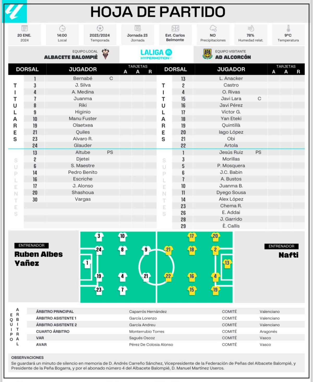 AD Alcorcón: Babin por López (min 46), Aday por Víctor (min 46), Sousa por Obi (min 69), Juanma por Lara (min 74) y Mosquera por Artola (min 84)