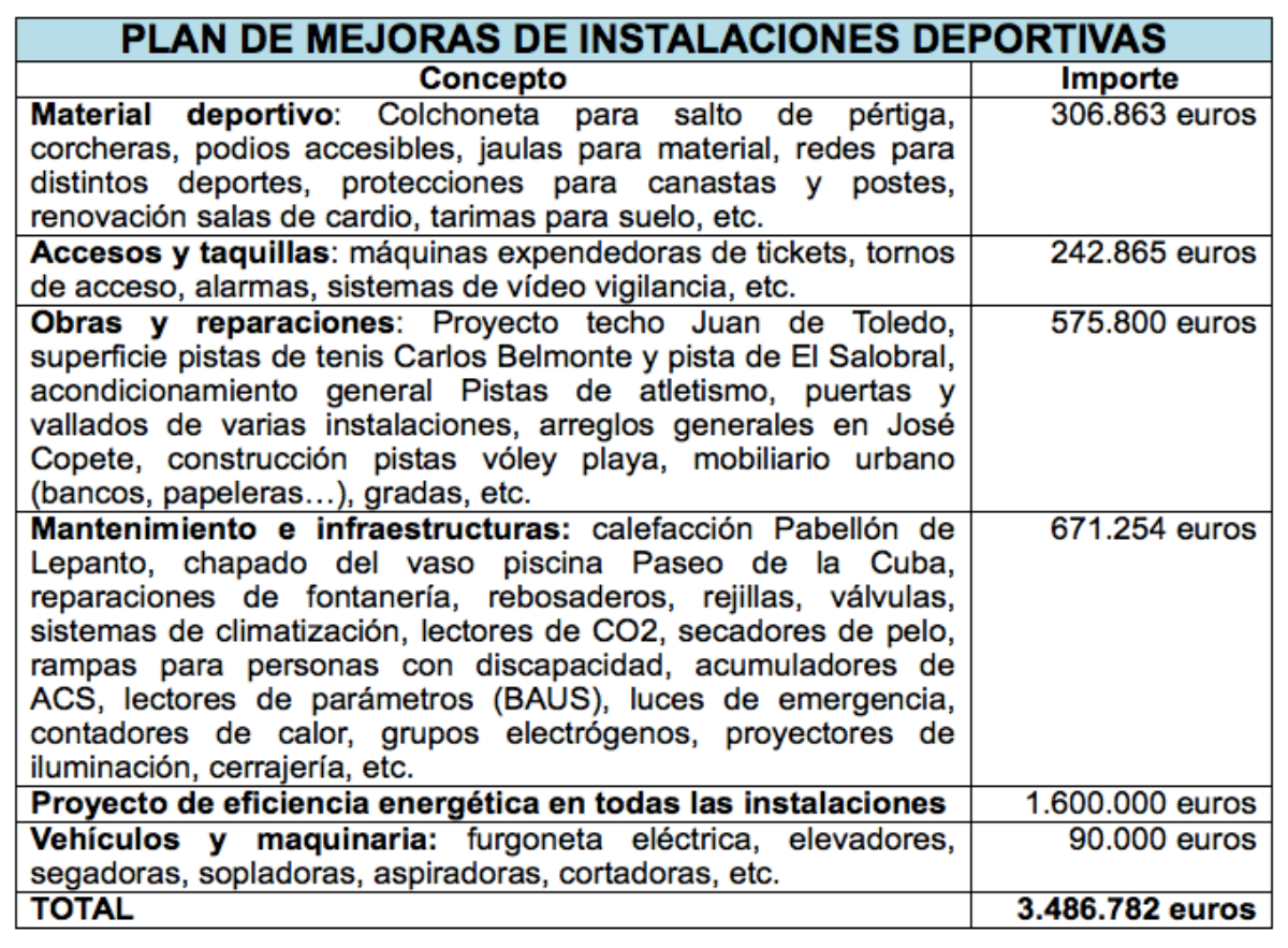 En cuanto a grandes obras y reparaciones, que cuentan con una inversión de 575.800 euros, el concejal de Deportes ha destacado el proyecto de reforma del techo de Juan de Toledo, una nueva superficie de pistas de tenis en el Carlos Belmonte y la pista de El Salobral, acondicionamiento general de las pistas de atletismo, donde se creará una nueva zona de calistenia, puertas y vallados de varias instalaciones, arreglos generales en José Copete, construcción pistas vóley playa, mobiliario urbano (bancos, papeleras…), gradas, etcétera.