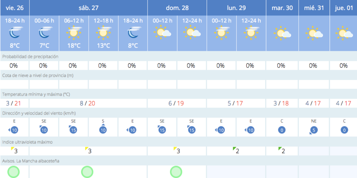 Las temperaturas oscilarán entre los 8 y los 20 grados en Albacete, entre los 3 y los 20 en Ciudad Real, entre 5 y 21 grados en Cuenca, entre 7 y 20 grados en Guadalajara y entre 4 y 18 grados en Toledo.