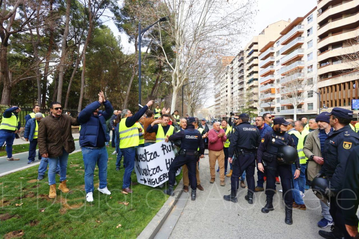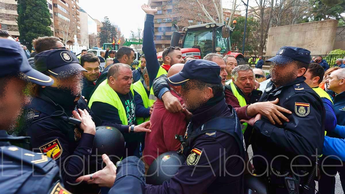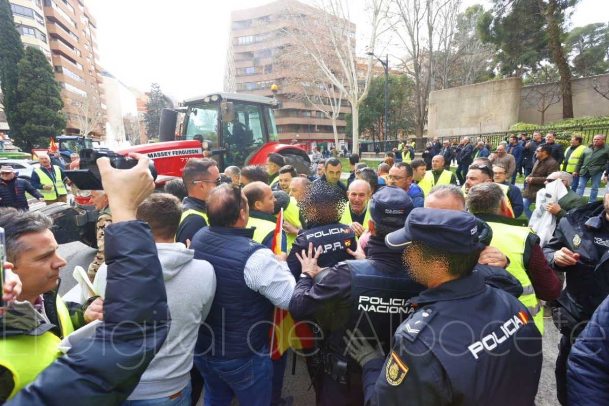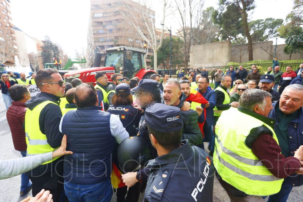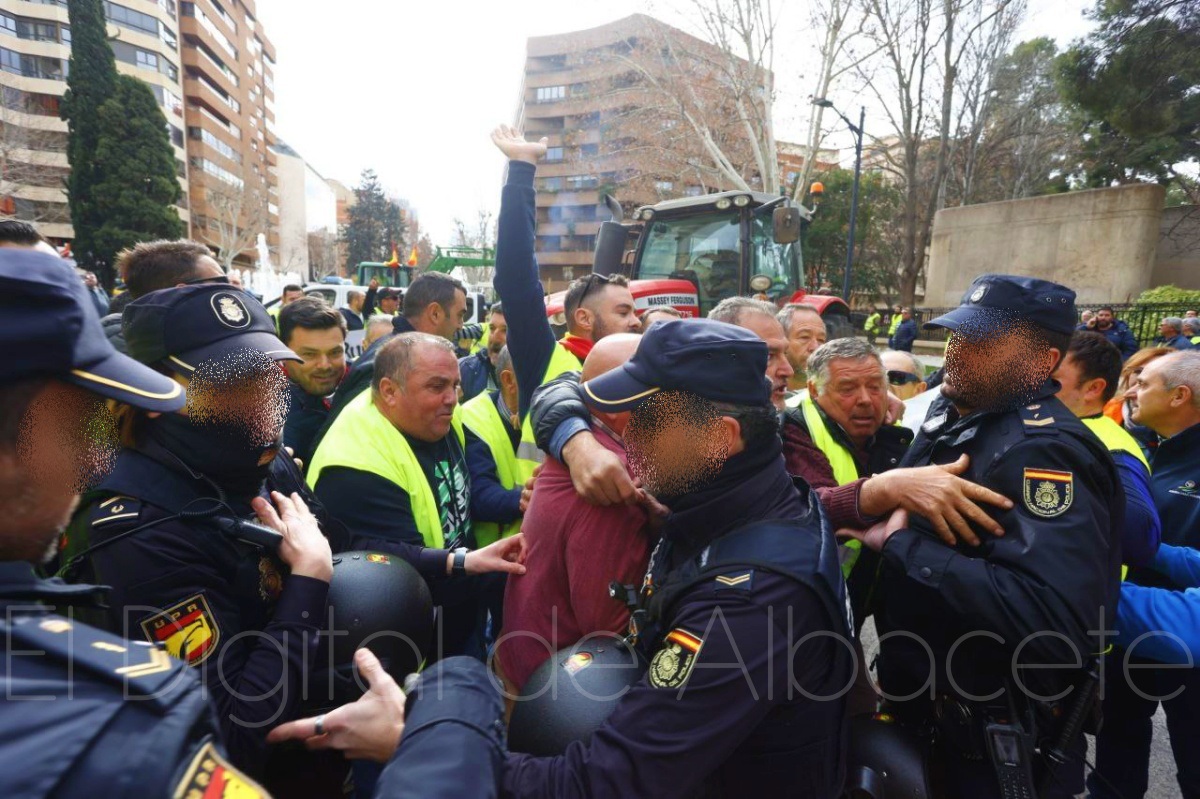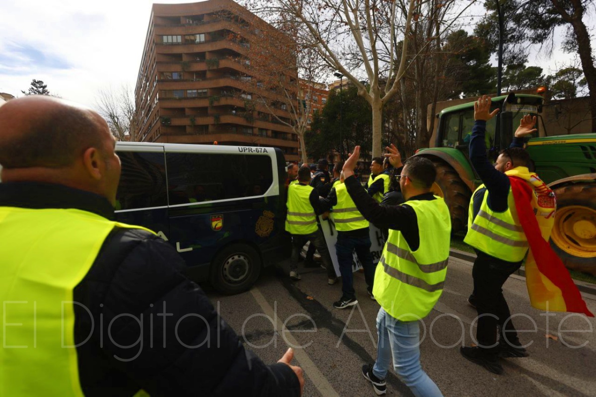 Fue precisamente ahí donde se vivieron momentos álgidos y de tensión entre manifestantes y fuerzas del orden, ya que la Policía había cortado la Avenida de España de Albacete para evitar que los tractores entraran a esta arteria de la ciudad y llegaran a la puerta de la Subdelegación del Gobierno, algo que no gustó nada a los agricultores, que querían llevar sus protestas hasta la puerta de la sede de la Subdelegación gubernamental de España en Albacete, ya que es precisamente al Gobierno de Pedro Sánchez al que dirigen sus críticas todos aquellos que viven del campo.