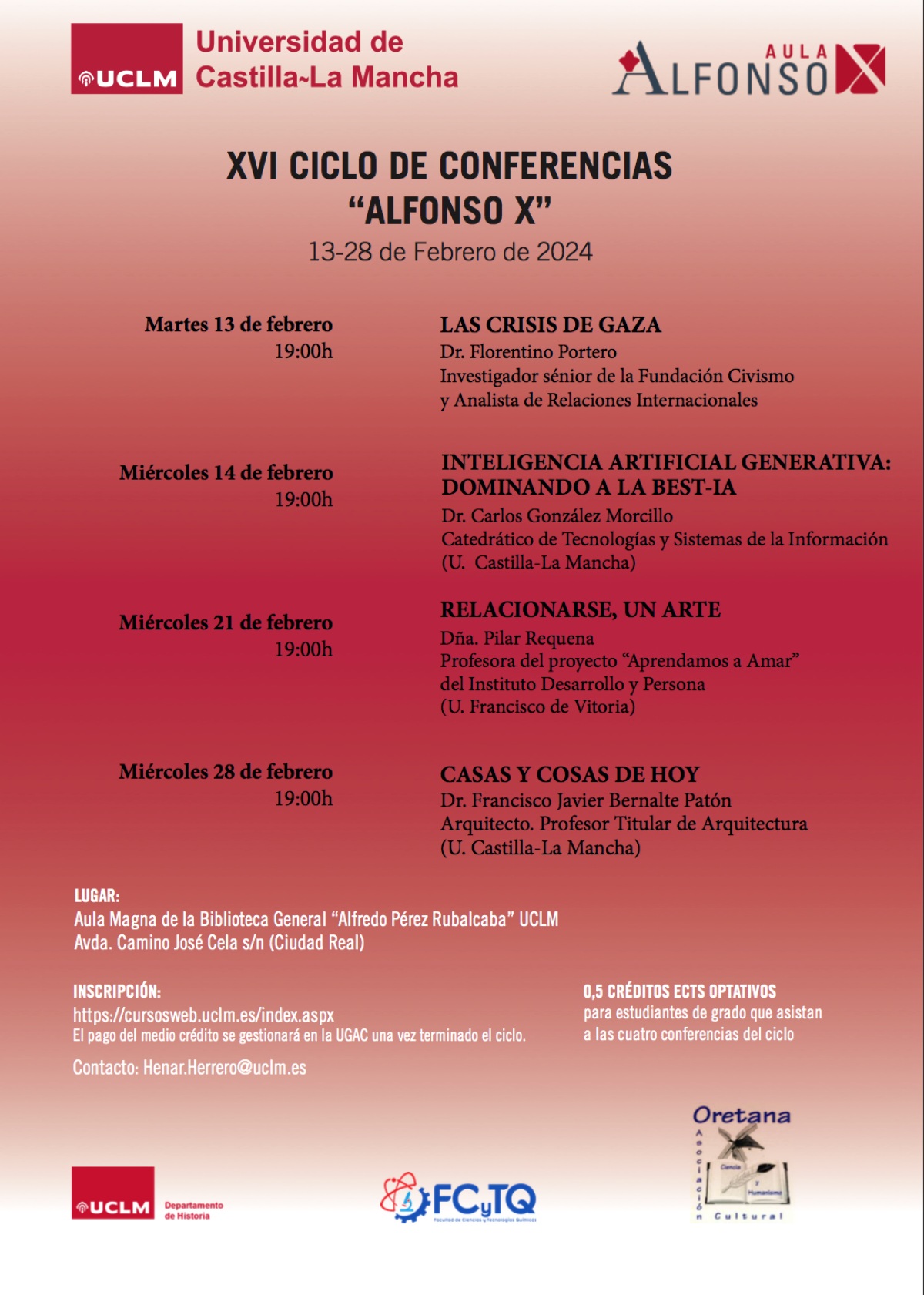 El Campus de Ciudad Real de la Universidad de Castilla-La Mancha (UCLM) acoge desde el próximo martes, 13 de febrero, una nueva edición del Ciclo de Conferencias Alfonso X, la iniciativa impulsada por personal docente e investigador de la institución académica que en esta ocasión abordará desde la crisis de Gaza a la inteligencia artificial.