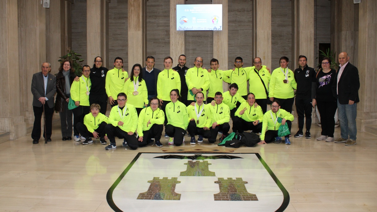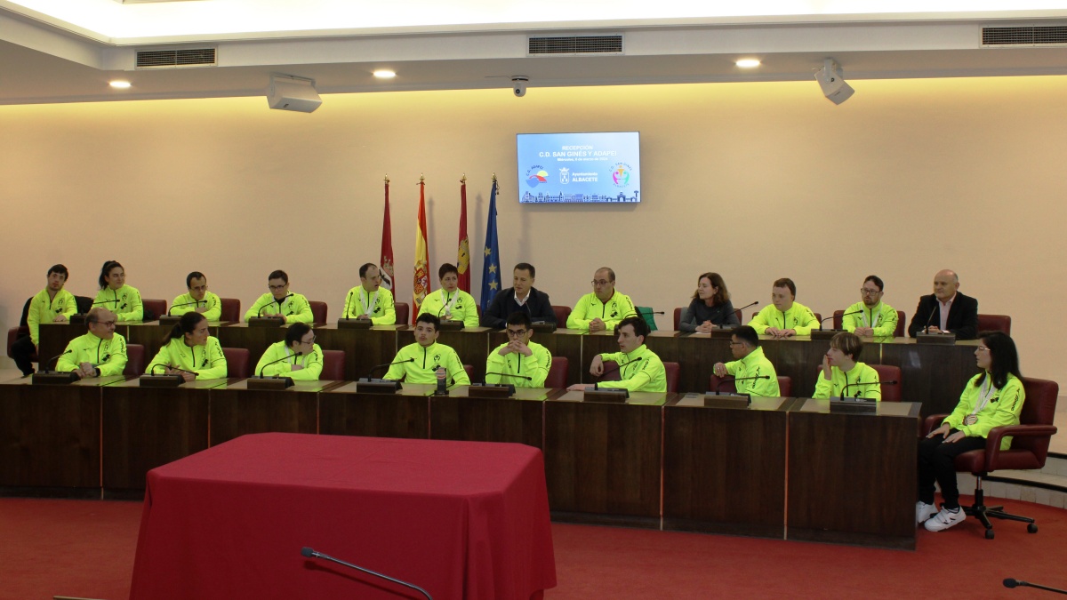 El alcalde de la ciudad y concejal de Inclusión, Manuel Serrano, ha felicitado en nombre de los albaceteños al C.D San Ginés y Adapei por conquistar el primer puesto en el Campeonato de España de Natación organizado por la Federación Española de Deportes para Personas con Discapacidad Intelectual (FEDDI) en Málaga del 29 de febrero al 3 de este mes, durante la recepción ofrecida en el salón de Plenos del Ayuntamiento, acompañado por el concejal de Deportes, Francisco Villaescusa, y otros miembros de la Corporación Municipal.
