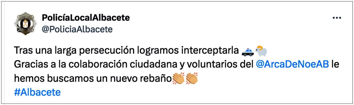 En la mañana de este jueves, la oveja que aparece en la imagen que acompaña estas líneas ha protagonizado una historia en Albacete que no es muy habitual en la capital manchega por el hecho de ser una ciudad, y es que, en un momento dado, decidió emprender una aventura en solitario y tras ser localizada vagando perdida tuvo que intervenir hasta la Policía Local de Albacete.