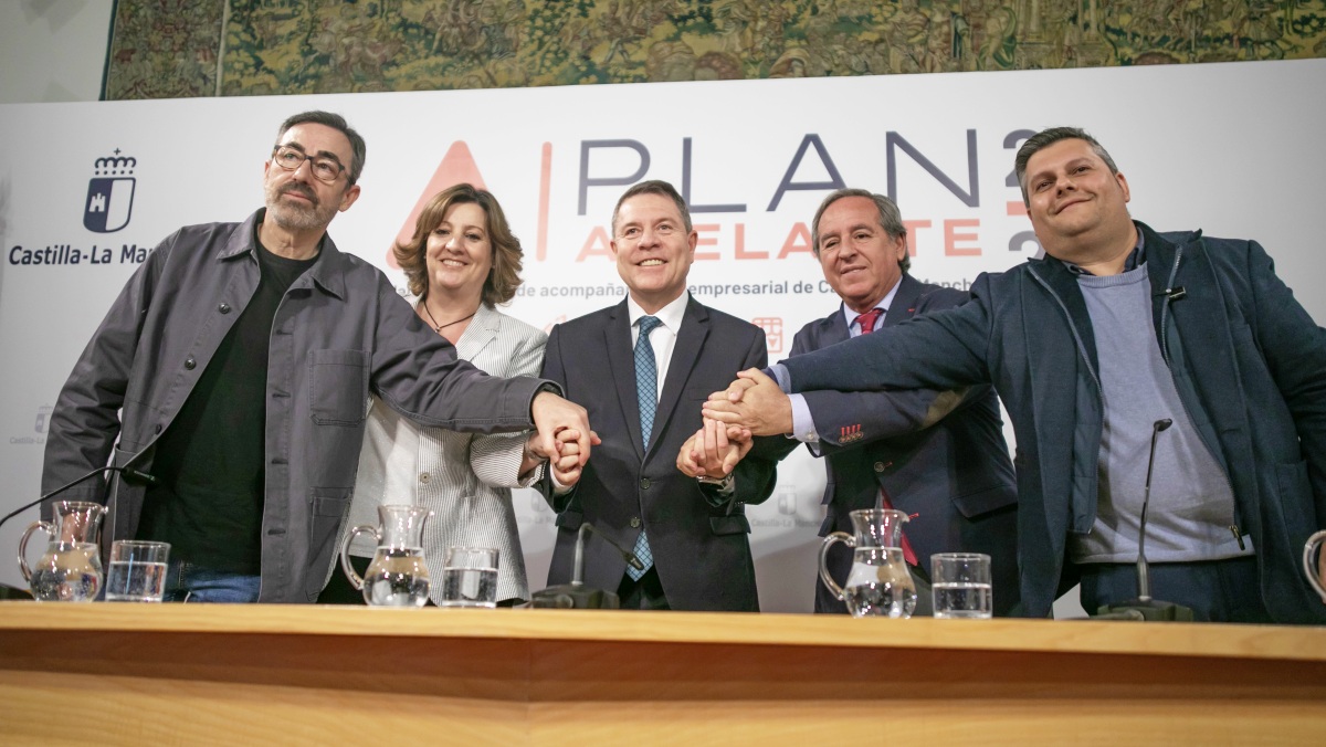En la firma del Plan Adelante, además del presidente regional, Emiliano García-Page, y de la consejera de Economía, Empresas y Empleo, Patricia Franco; han participado el presidente de CECAM, Ángel Nicolás; el secretario regional de CCOO, Paco de la Rosa; y el secretario regional de UGT, Luis Manuel Monforte.