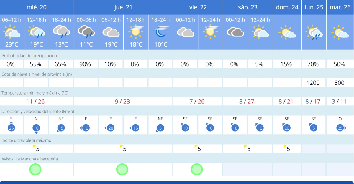 Así pues, Albacete y su provincia quedarían en principio fuera de dichos avisos y alertas. La predicción de la AEMET para Albacete capital es la siguiente: