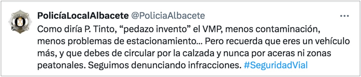 Al respecto la Policía Local de Albacete recordaba que “aunque el patinete sea un gran invento porque produce menos contaminación y ofrece menos problemas de estacionamiento”, es un “vehículo más y por tanto se debe circular con el por la calzada”.