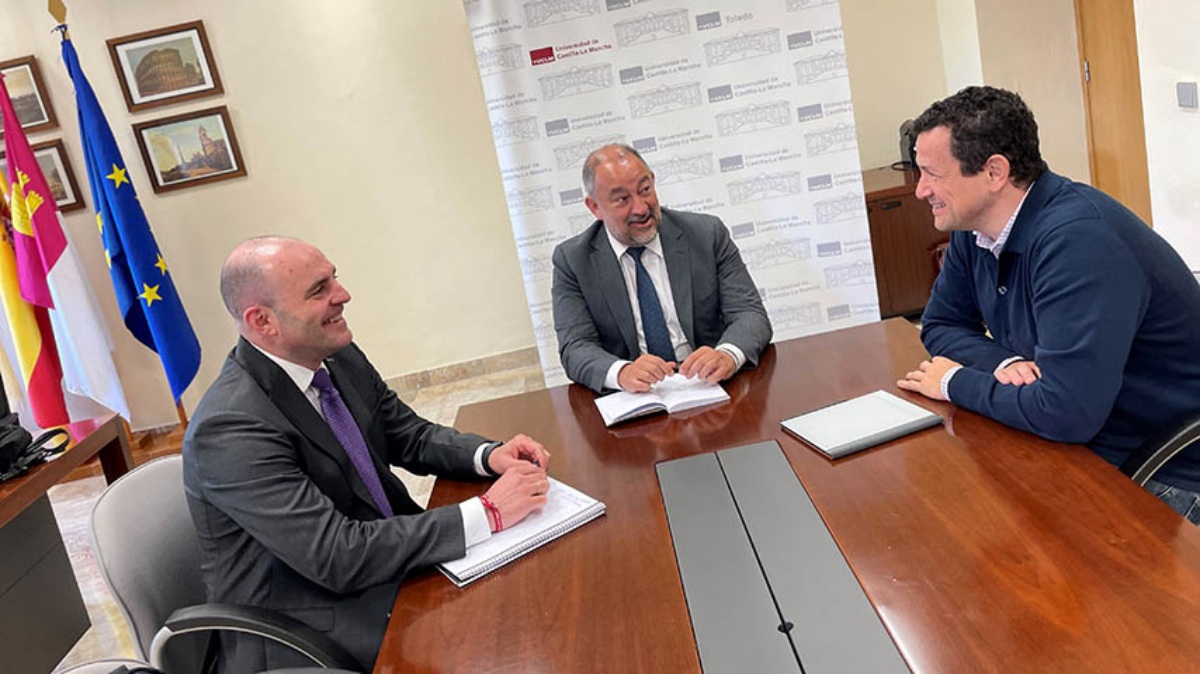 El rector de la Universidad de Castilla-La Mancha (UCLM), Julián Garde, acompañado por el vicerrector de Ciencias de la Salud, Alino Martínez, ha mantenido un encuentro de trabajo con el nuevo director científico del Instituto de Investigación Sanitaria de Castilla-La Mancha (IDISCAM), Manuel Sánchez de la Torre, a su vez profesor e investigador posdoctoral de la Facultad de Fisioterapia y Enfermería de Toledo en el marco del programa de ayudas ‘Ramón y Cajal’.