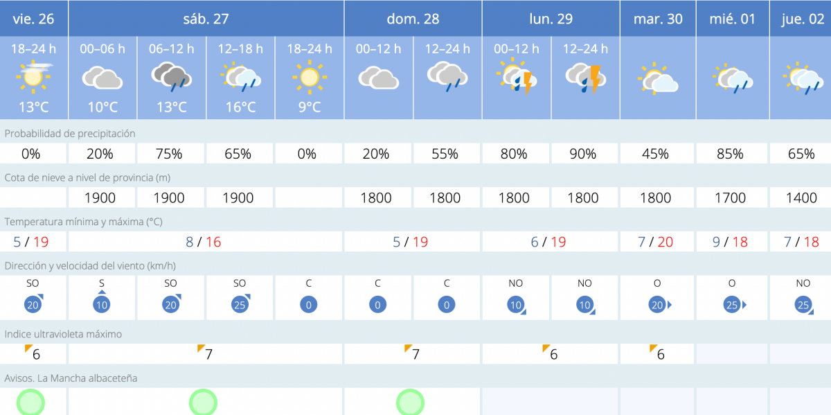 Las temperaturas oscilarán entre los 8 y los 16 grados en Albacete, entre los 10 y los 18 en Ciudad Real, entre 7 y 17 grados en Cuenca, entre 8 y 16 grados en Guadalajara y entre 8 y 18 grados en Toledo.