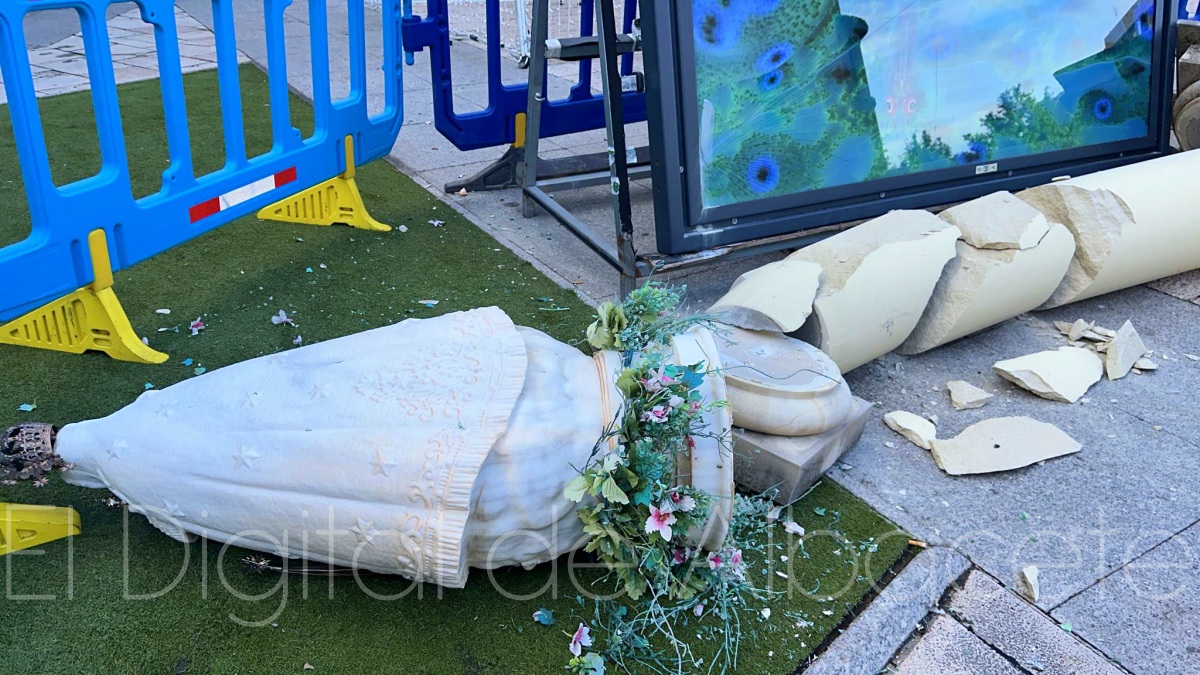 Por los suelos terminaba la imagen de la Virgen de Los Llanos instalada en la Plaza de la Catedral tras un incidente acontecido hace unos meses en este punto de Albacete capital. Todo ocurría el pasado mes de diciembre cuando, en las labores de instalación de una exposición fotográfica de la Fundación La Caixa, se producía el derrumbe de la columna existente en dicha plaza y en cuya parte superior se encontraba una réplica en piedra de la patrona de Albacete.