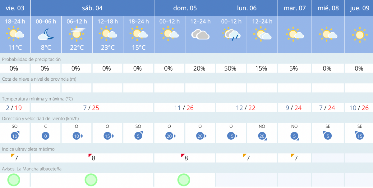 Las temperaturas oscilarán entre los 7 y los 25 grados en Albacete, entre los 8 y los 25 en Ciudad Real, entre 4 y 23 grados en Cuenca, entre 8 y 24 grados en Guadalajara y entre 10 y 26 grados en Toledo.