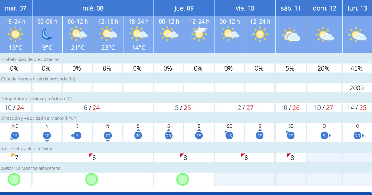 Conforme avance la semana, las temperaturas irán ‘in crescendo’ en Albacete capital hasta alcanzar valores que rondarán los treinta grados centígrados; tal y como muestra la siguiente predicción de la AEMET: