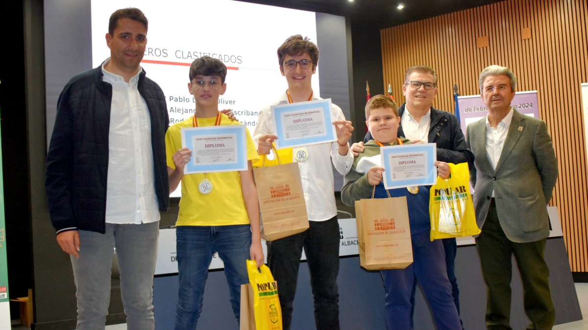 El diputado provincial de Juventud y Deportes, Dani Sancha, ha participado en este acto, junto aDiego Pérez, delegado provincial de Educación, Cultura y Deportes, y a Serapio García y Juan Martínez-Tébar, presidente y secretario de la Sociedad Castellano-Manchega de Profesores de Matemáticas, entidad que organiza esta iniciativa sumando la colaboración y el respaldo económico de la Diputación de Albacete desde su primera edición en 1990.