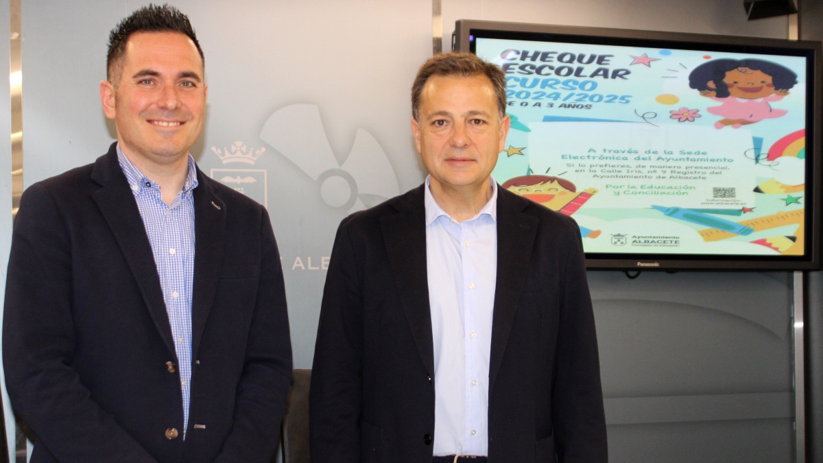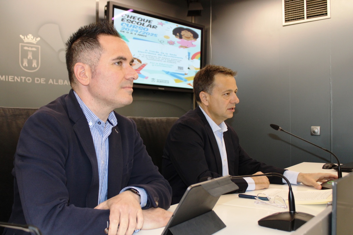 El alcalde de Albacete, Manuel Serrano, ha presentado las bases para una nueva convocatoria del cheque escolar para el curso 2024/25 junto al concejal de Educación, Pascual Molina, tras su aprobación en el día de ayer en Junta de Gobierno, destacando que el aumento presupuestario hasta los 500.000 euros, 140.000 euros más que el año pasado y un incremento de casi el 40 por ciento, incrementará el número de beneficiarios y también las cuantías de las ayudas concedidas.