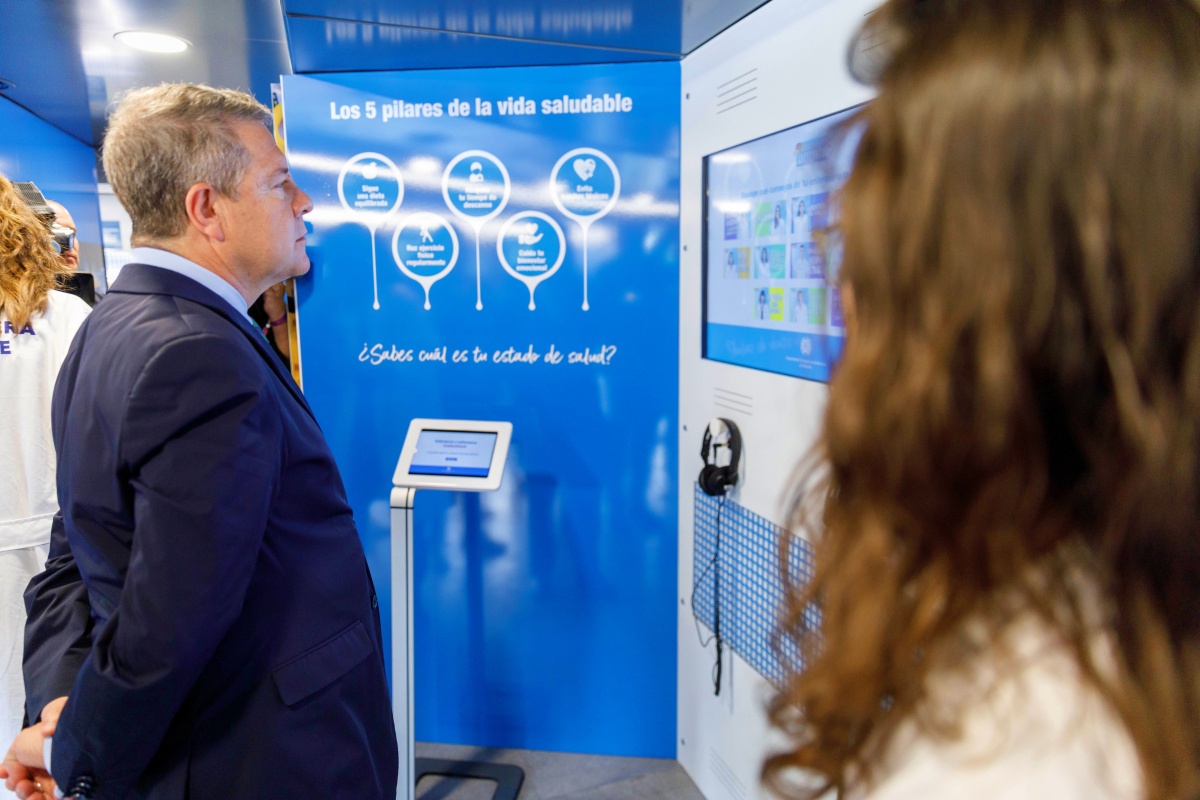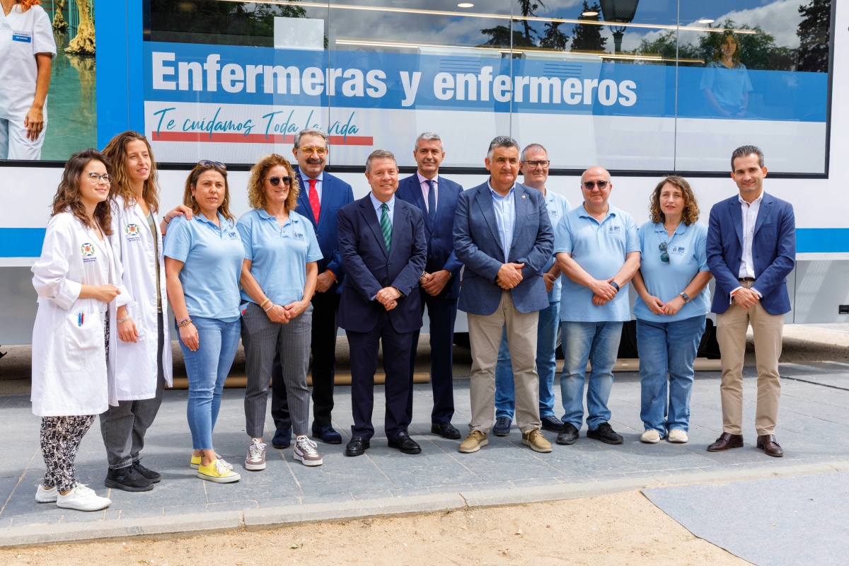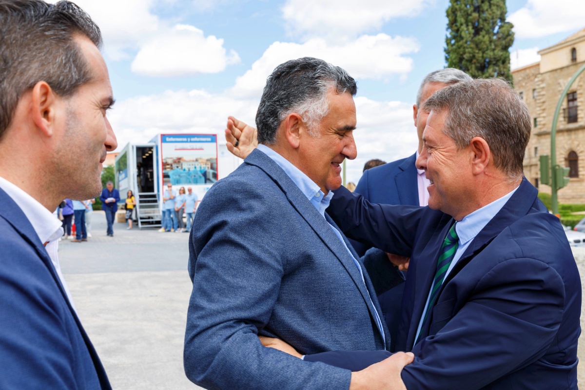 En el toledano Paseo de Merchán, donde hasta el jueves, quedará instalado este tráiler informativo, el presidente castellanomanchego ha estado acompañado también por el delegado de la Junta en Toledo, Álvaro Gutiérrez; y por el presidente del Colegio Oficial de Enfermería de Toledo, Roberto Martín, entre otros.