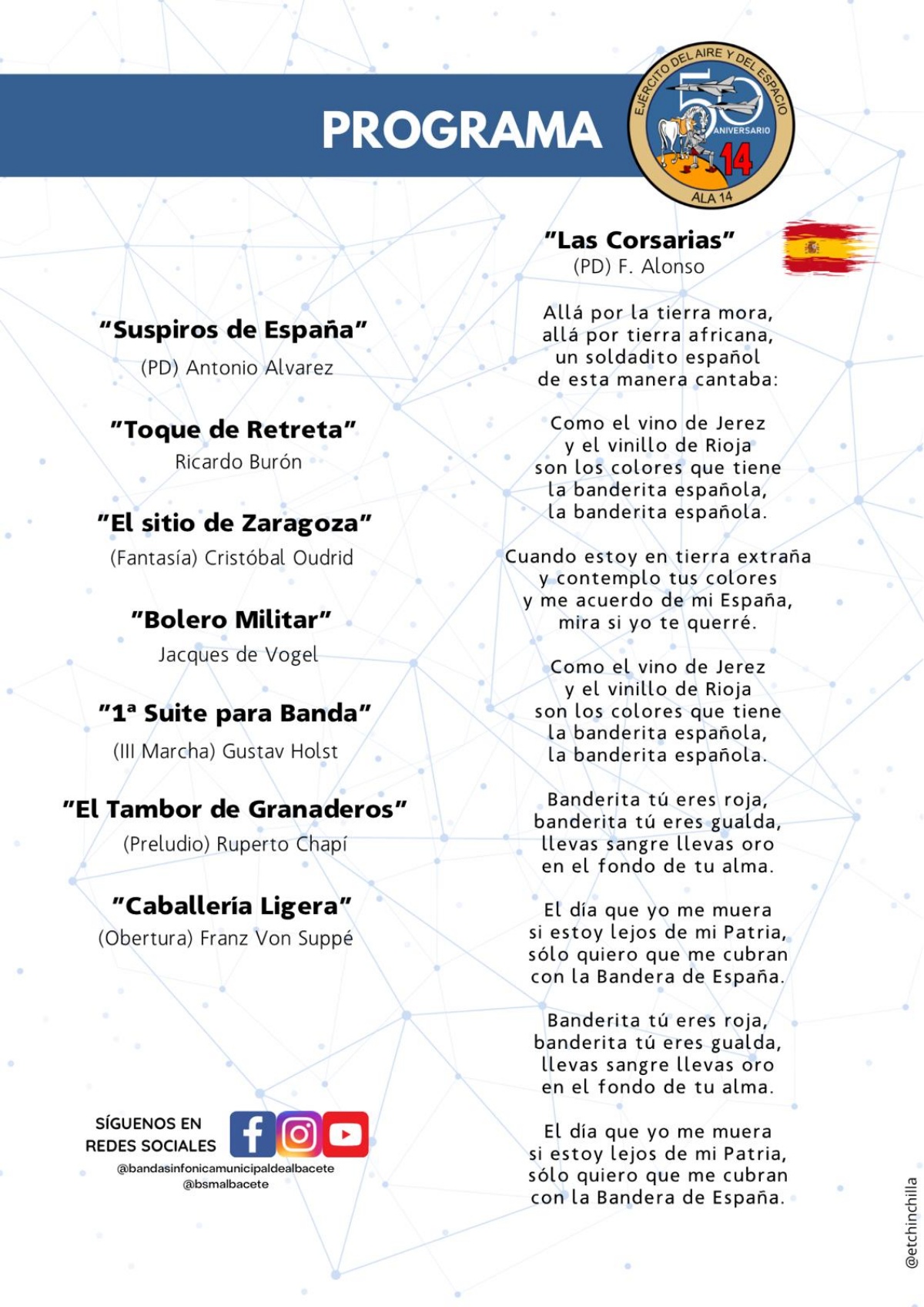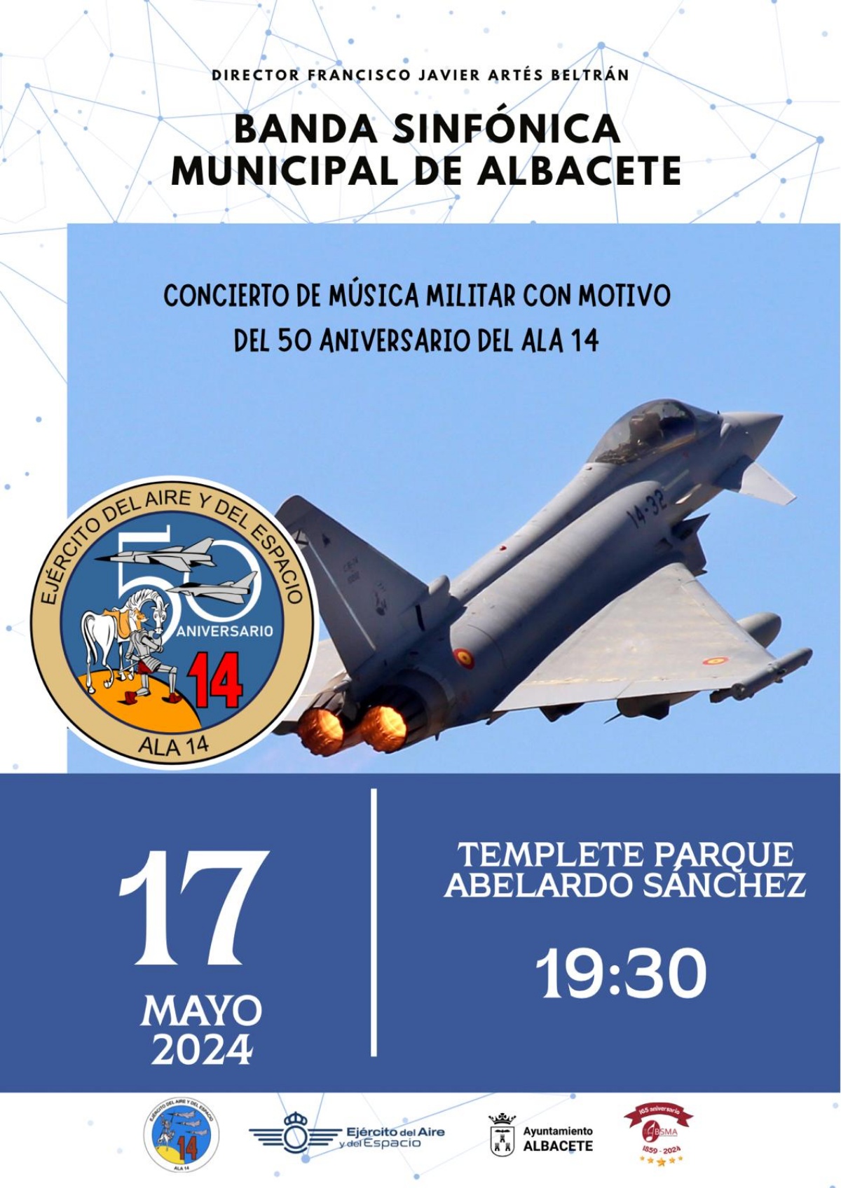 Concretamente, este especial acto con motivo del 50 aniversario del Ala 14 en la Base Aérea de Albacete se celebrará en el corazón de la ciudad. Para comenzar, a las 19:30 horas, la Banda Sinfónica Municipal ofrecerá un concierto de música militar en el Templete del Parque Abelardo Sánchez. La Banda Sinfónica Municipal de Albacete, con su director Francisco Javier Artés al frente, interpretará piezas como ‘Suspiros de España’, ‘Toque de Retreta’, ‘Bolero Militar’ o ‘Caballería Ligera’, entre otras