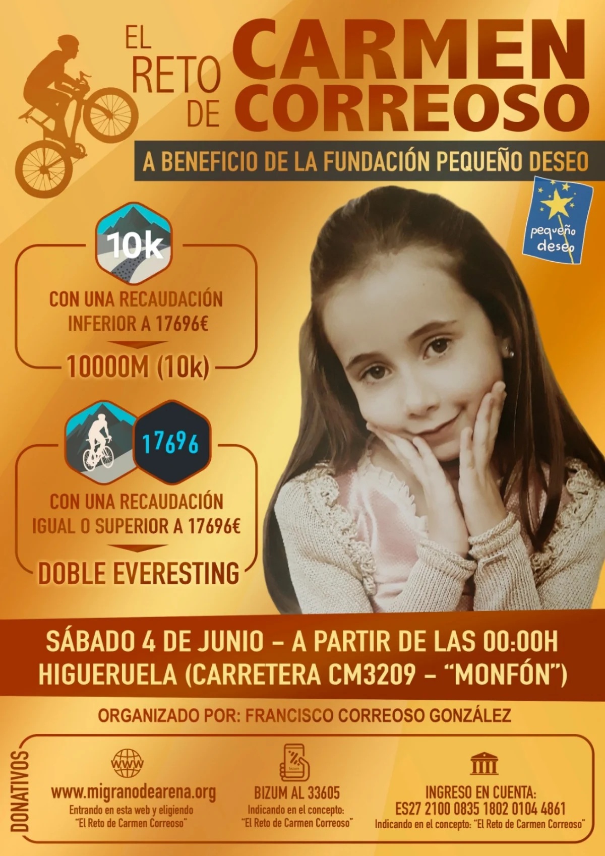 Francisco Correoso se enfrenta a una sola etapa en bicicleta de 1.150 kilómetros por carretera desde Fisterra (A Coruña) a Higueruela (Albacete) para completar el ‘Reto de Carmen‘ y conseguir dinero para la Fundación Pequeño Deseo y así apoyar a niños enfermos.