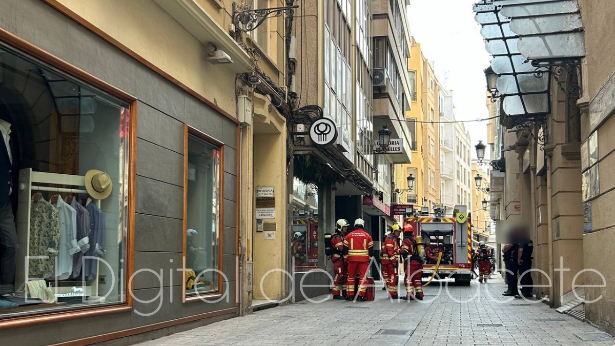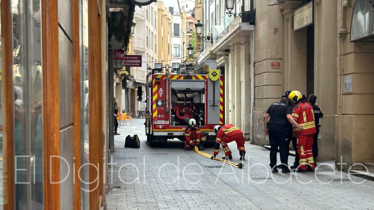 Los efectivos desplazados llegaban a introducir una manguera en este inmueble de la calle Concepción, muy próximo a la concurrida calle Ancha. Además, posteriormente los Bomberos de Albacete introducían ventiladores para despejar la zona de cualquier tipo de humo, aunque todo parece haber quedado en un susto.