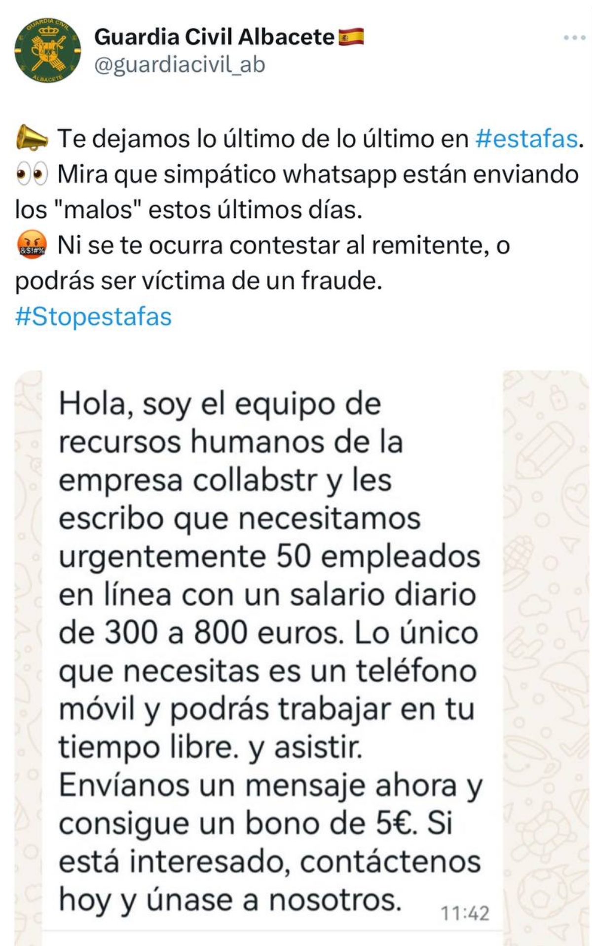 Este tipo de fraudes llegan a través de mensajes de WhatsApp a los usuarios, en los que los presuntos estafadores que están detrás del teléfono ofrecen un puesto de empleo. Concretamente, en la captura de pantalla que ha compartido la Guardia Civil de Albacete a través de X (antes Twitter), se puede leer que el supuesto estafador se presenta como “el equipo de recursos humanos de la empresa”, e informa a su posible víctima de que “necesitamos urgentemente 50 empleados en línea con un salario diario de 300 a 800 euros”.