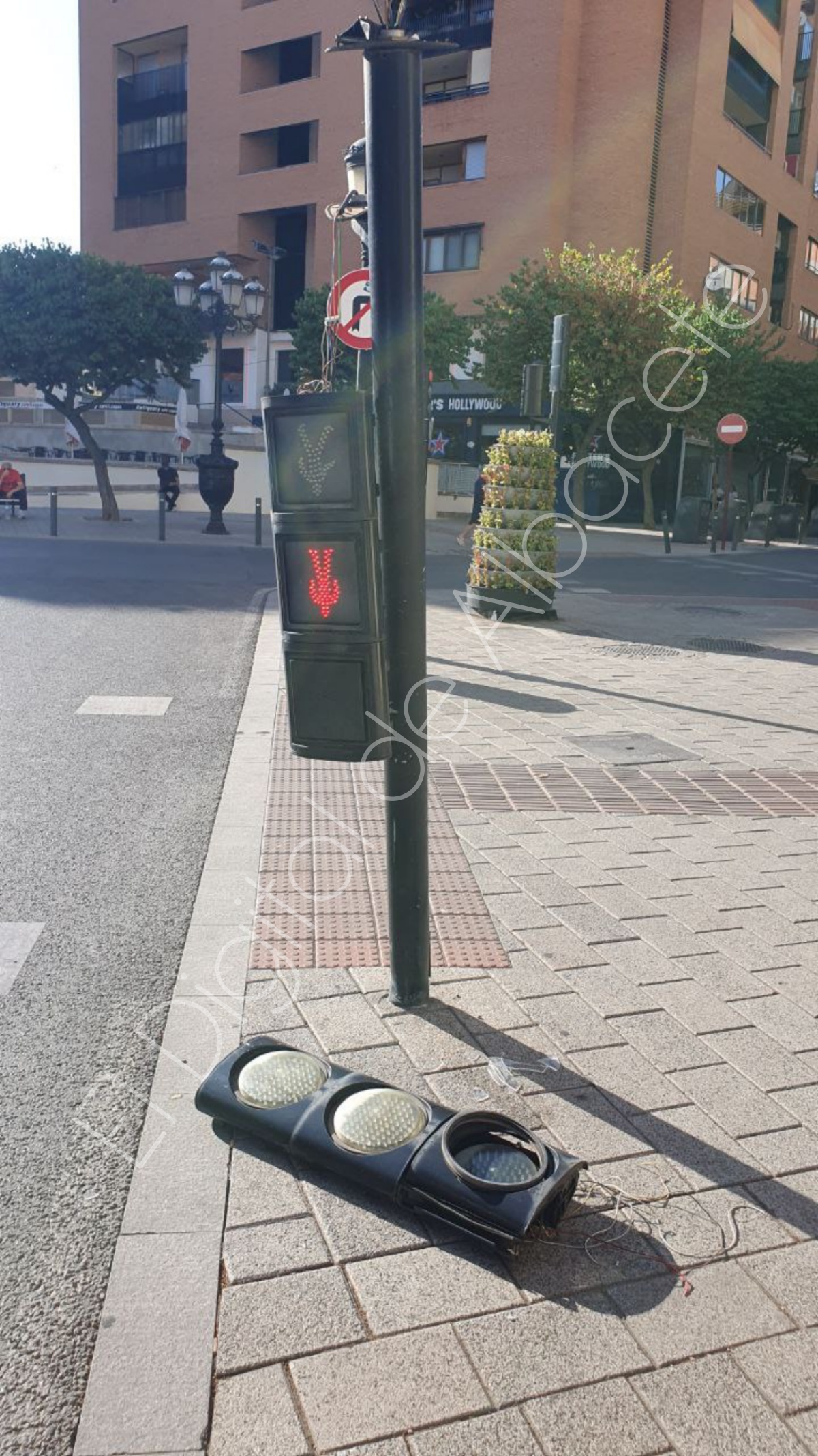 Así quedaba este semáforo, localizado en un céntrico punto de la ciudad de Albacete, tras un accidente de tráfico.