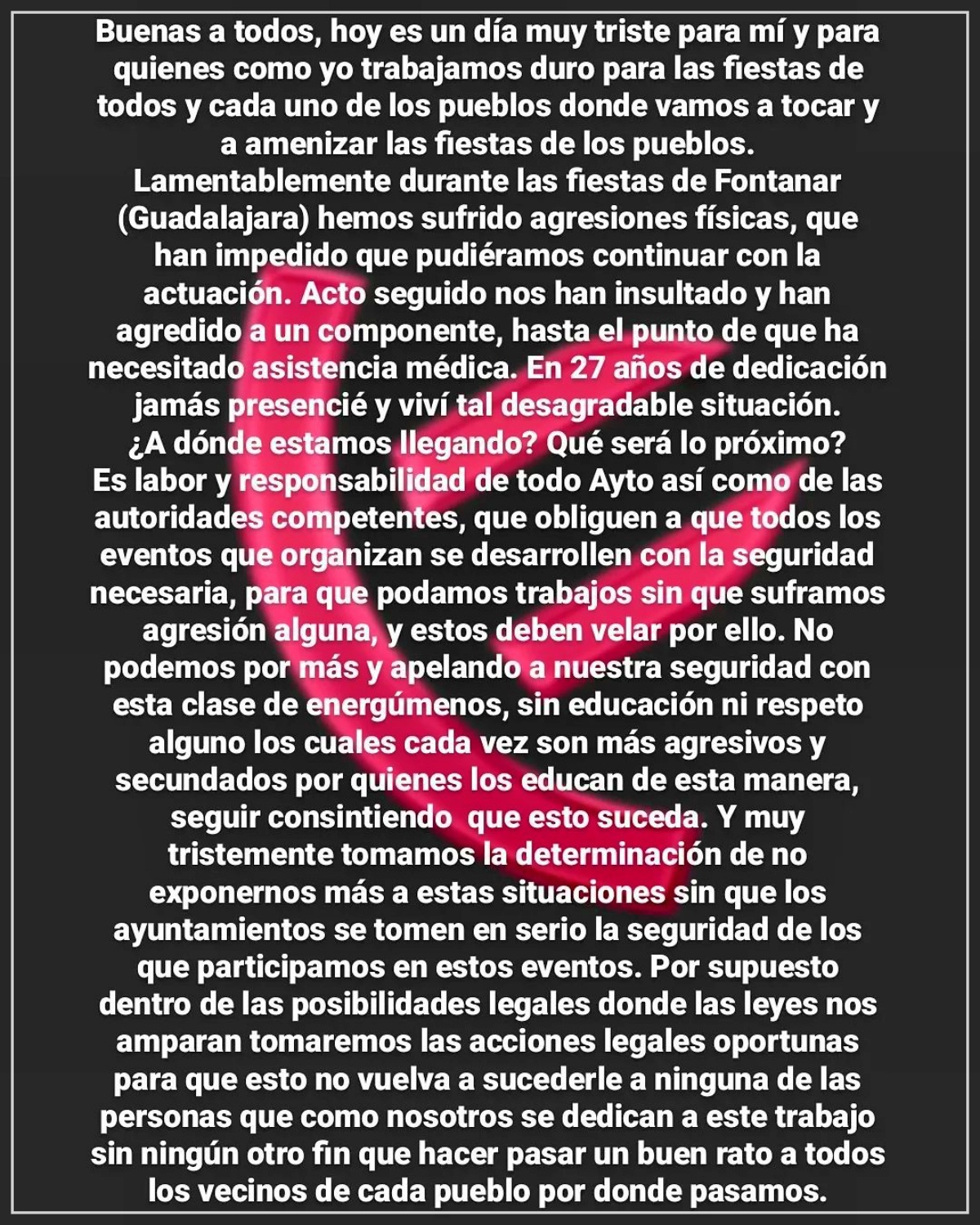 Para finalizar, los músicos indican que “por supuesto, dentro de las posibilidades legales donde las leyes nos amparan, tomaremos las acciones legales oportunas para que esto no vuelva a sucederle a ninguna de las personas que como nosotros se dedican a este trabajo sin ningún otro fin que hacer pasar un buen rato a todos los vecinos de cada pueblo por donde pasamos”.