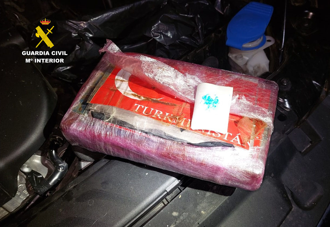 Tras la identificación de sus dos ocupantes, los agentes del dispositivo realizaron una inspección, tanto de sus pertenencias como del vehículo en el que viajaban, localizando, en el interior del filtro de aire, un paquete que contenía 1.100 gramos de una sustancia en polvo, de color blanquecino que, tras ser analizada con un narcotest, resultó ser cocaína.