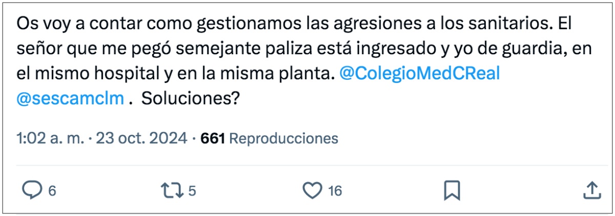 Una médico especialista en Psiquiatría natural de Albacete que prefiere mantenerse en el anonimato ha sido la protagonista de una desagradable situación en el Hospital de Ciudad Real, centro sanitario en el que trabaja, pues tras haber sido agredida de importancia tiempo atrás por uno de sus pacientes y haber sido condenado éste incluso a 6 meses de cárcel por aquel violento episodio, en las últimas horas la doctora ha tenido que hacer frente a una compleja y dolorosa moralmente experiencia: «El señor que me pegó semejante paliza está ingresado y yo de guardia, en el mismo hospital y en la misma planta», denunciaba ella misma este miércoles en ‘X’, antiguo Twitter.
