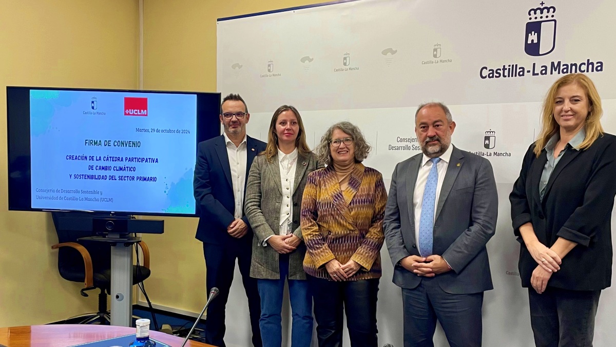 El rector de la Universidad de Castilla-La Mancha (UCLM), Julián Garde, y la consejera de Desarrollo Sostenible, Mercedes Gómez, han suscrito este martes en Toledo el convenio para la creación de la Cátedra Participativa de Cambio Climático y Sostenibilidad del Sector Primario, que llevará a cabo actividades de docencia, investigación y transferencia con el objetivo de contribuir al desarrollo de políticas públicas orientadas a la descarbonización.