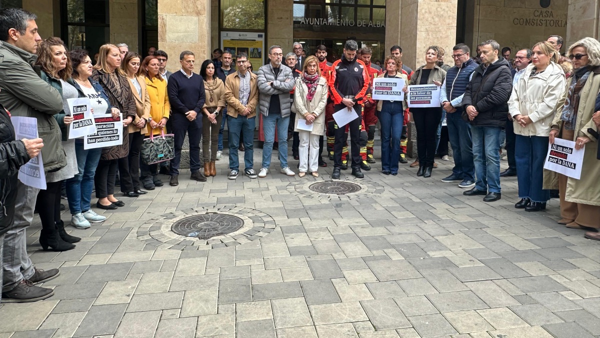 El alcalde de la ciudad, Manuel Serrano, junto a concejales del Equipo de Gobierno, miembros de la Corporación y trabajadores municipales, ha asistido a la concentración convocada esta mañana en la puerta del Ayuntamiento de Albacete por los sindicatos Comisiones Obreras (CCOO), la Unión General de Trabajadores (UGT) y la Unión Sindical Obrera (USO) para trasladar una vez más su cariño, apoyo y solidaridad a las víctimas de la DANA.