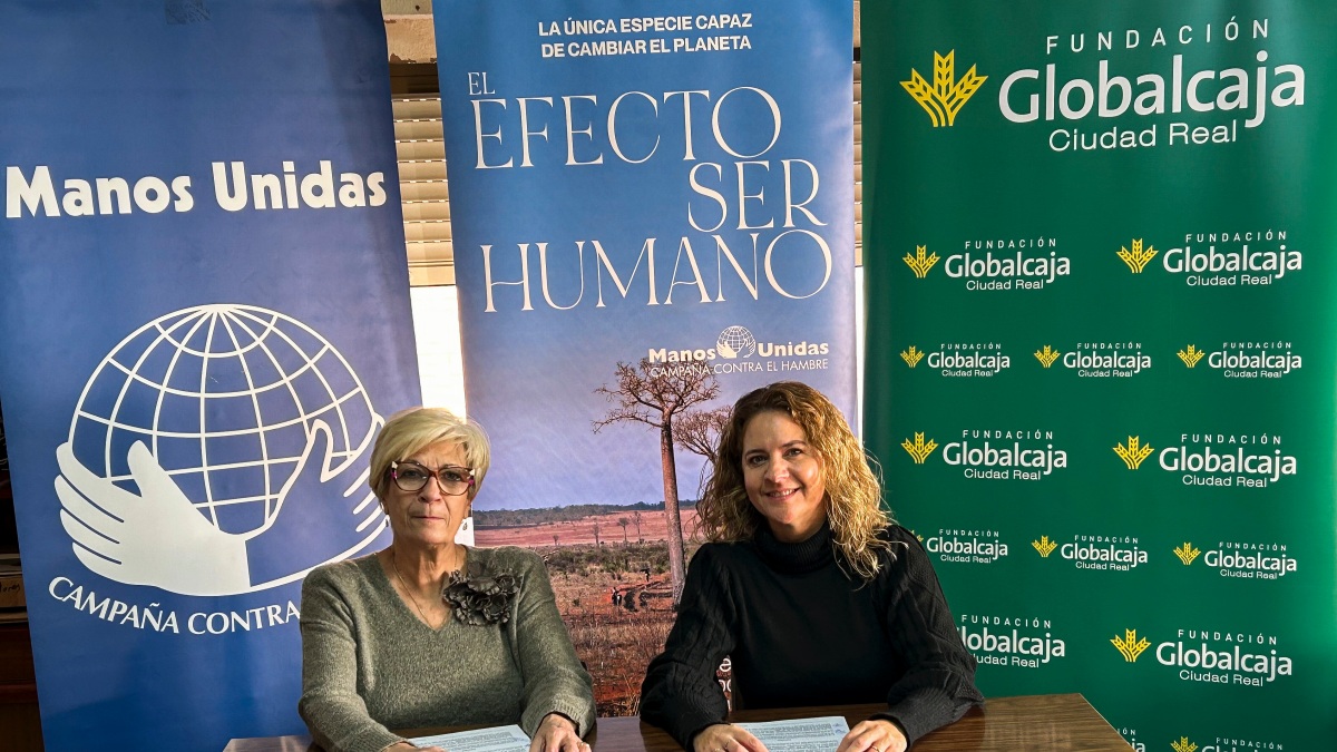 La directora de la Fundación Globalcaja en Ciudad Real, María Teresa Carmona, y la presidenta-delegada diocesana de Manos Unidas, Concepción Martínez, han sellado esta colaboración que se enmarca en el proyecto cultural y de educación para el desarrollo que lleva a cabo Manos Unidas, dentro de su actual campaña ‘El efecto ser humano’.