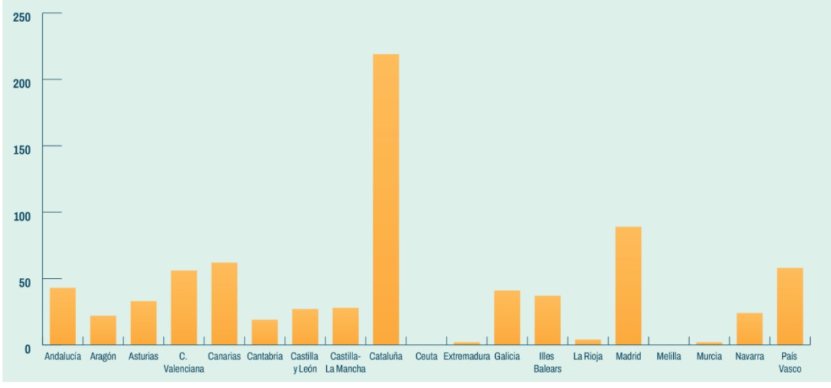 La distribución de las 766 solicitudes de eutanasia registradas en todo el territorio nacional es la siguiente: Cataluña 219, Madrid 89, Canarias 62, País Vasco 58, Comunidad Valenciana 56, Andalucía 43, Galicia 41, Islas Baleares 37, Asturias 33, Castilla-La Mancha 28, Castilla y León 27, Navarra 24, Aragón 22, Cantabria 19, La Rioja 4, Extremadura 2, Murcia 2, Melilla 0 y Ceuta 0.