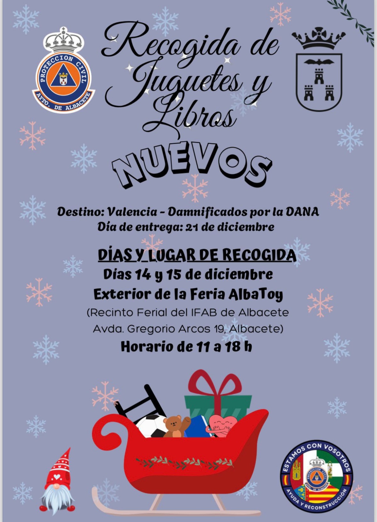 El Ayuntamiento de Albacete junto a la Agrupación de Voluntarios de Protección Civil va a iniciar mañana una recogida de juguetes y libros nuevos para ayudar a los damnificados por los efectos de las inundaciones de Valencia en la Feria de Coleccionismo, Juego y Ocio, ‘Albatoy’, situándose en el exterior del Recinto Ferial del IFAB.