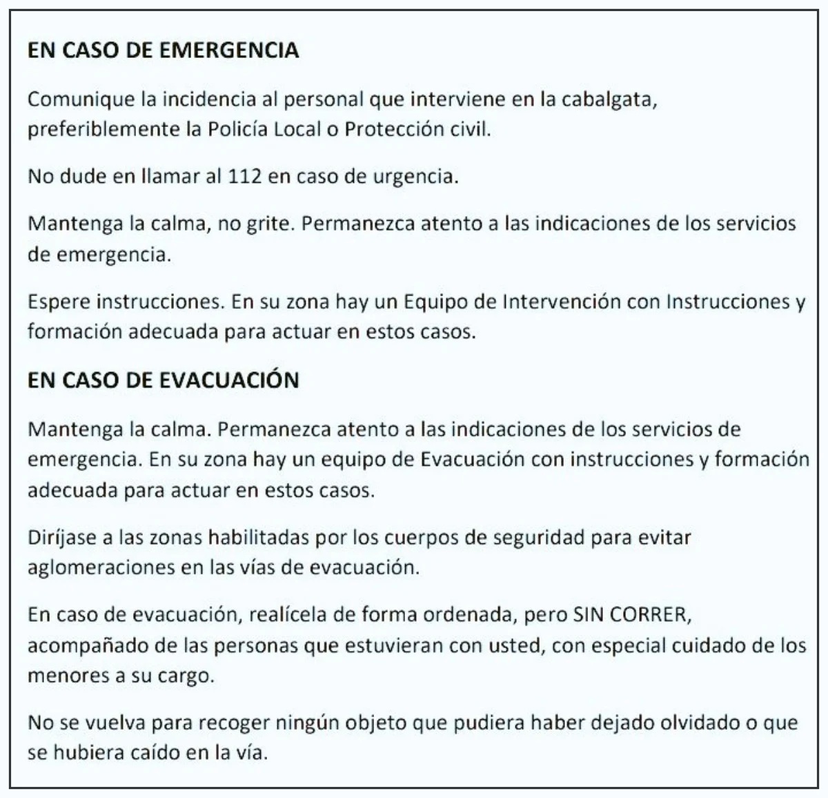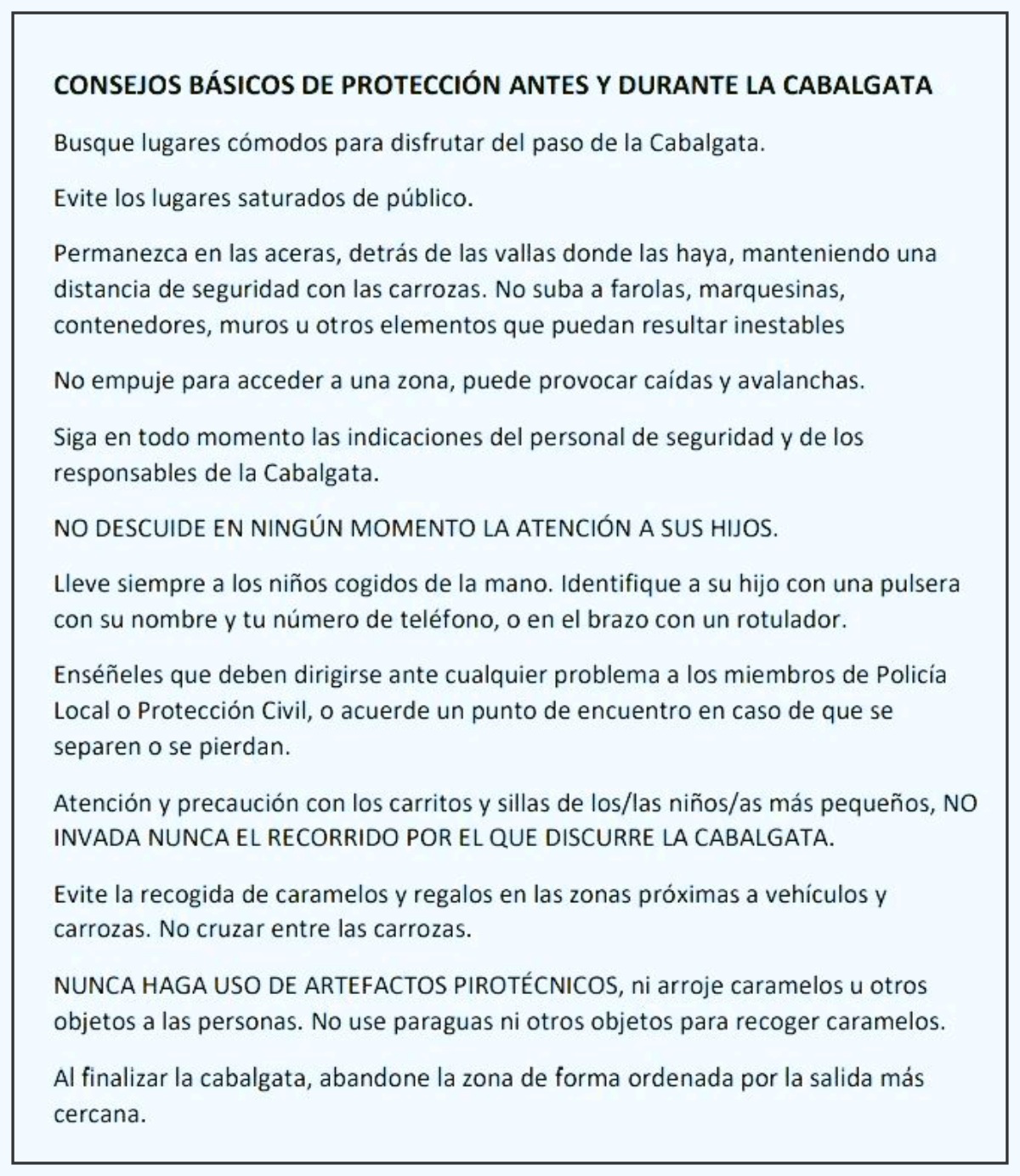 En pro de la seguridad, es también importante que el público asistente vaya con antelación a los actos programados, tanto a la Plaza de Toros como al recorrido de la Cabalgata en sí, para poder asegurar así el máximo orden y comodidad.