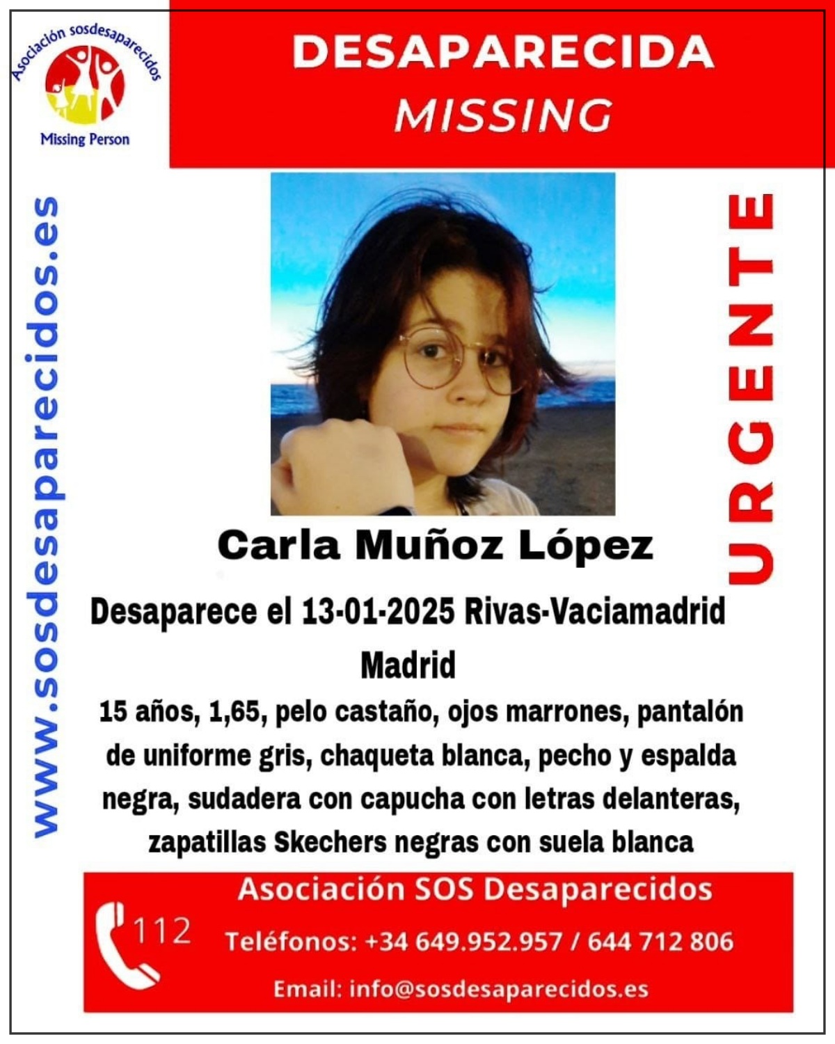 Se trata de Carla mide 1,65 metros, tiene el pelo castaño y ojos marrones. En el momento de su desaparición vestía un pantalón de uniforme gris, una chaqueta blanca con pecho y espalda negra, una sudadera con capucha con letras en la parte delantera y zapatillas marca Skechers negras con suela blanca.