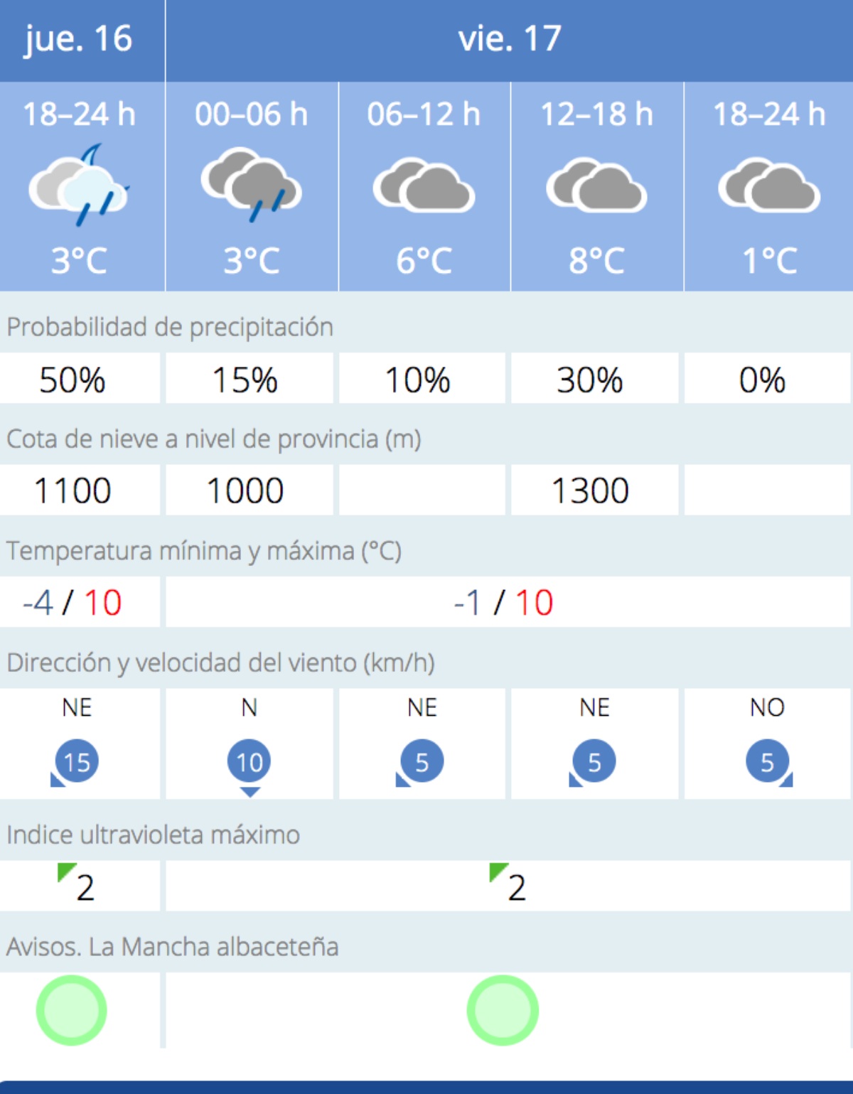 Se esperan precipitaciones débiles dispersas en Albacete, que no se descartan en el extremo oriental de Guadalajara y de Cuenca. La cota de nieve estará a 900 a 1.100 metros subiendo durante la mañana a 1.000 o 1.200 y hasta 1.500 en el sureste.