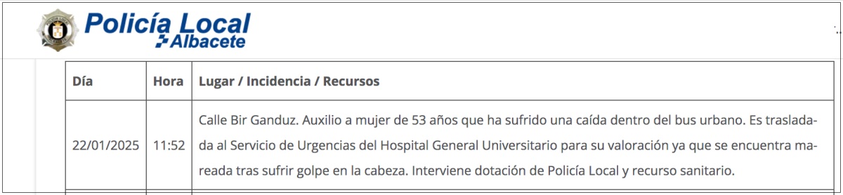 Como decimos, será la investigación de la Policía Local de Albacete la que tendrá que poner los puntos sobre las íes y decir a ciencia cierta cuales fueron los motivos de la caída de esta pasajera. La afectada es una mujer de 53 años.