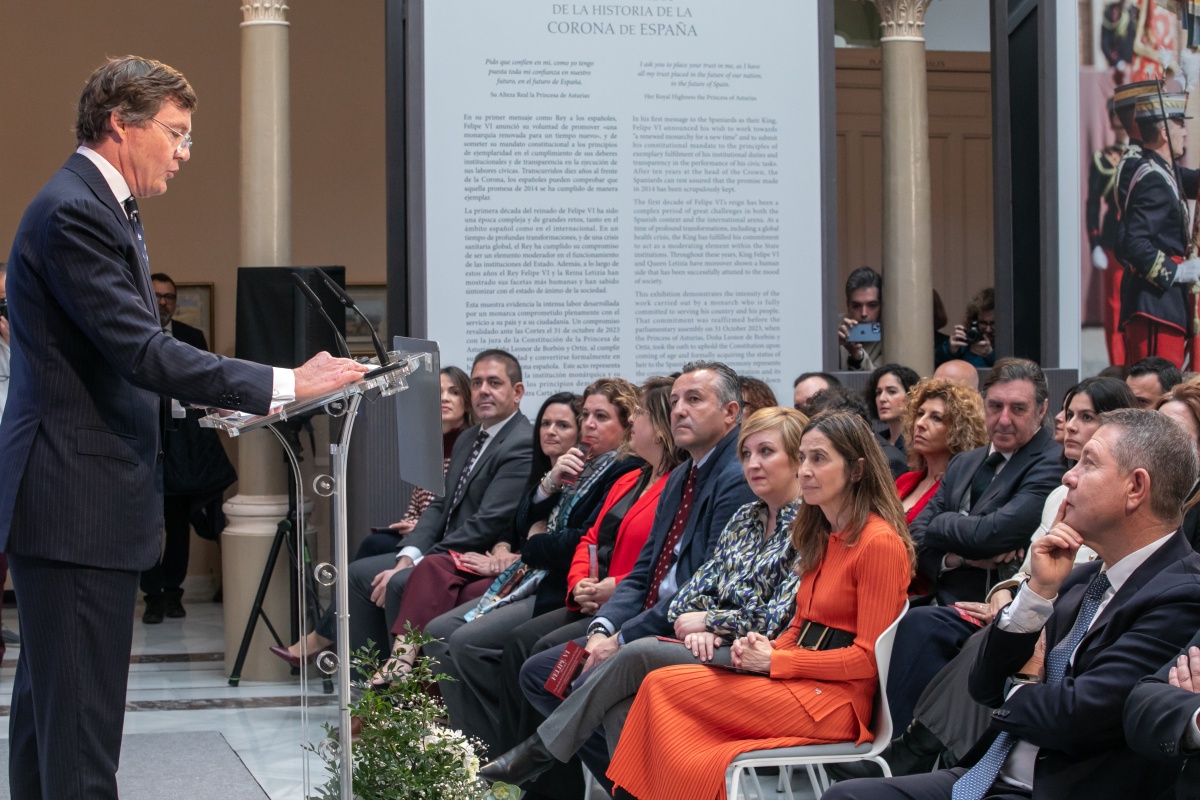 La muestra recoge algunos de los momentos más emblemáticos de los diez años de reinado de Felipe VI, que se cumplieron en 2024. Se compone de 23 fotografías seleccionadas y comisariadas por los académicos de la Historia y de Bellas Artes Enrique Moradiellos, el castellanomanchego Publio López Mondéjar, y el arquitecto Francisco Bocanegra, responsable de la museografía.