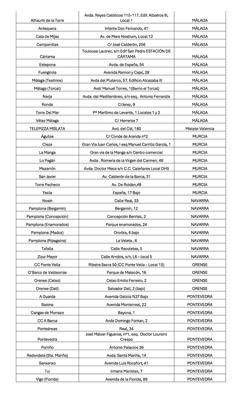 Los locales de Telepizza adheridos y no adheridos a la promoción de pizza gratis son los siguientes:
