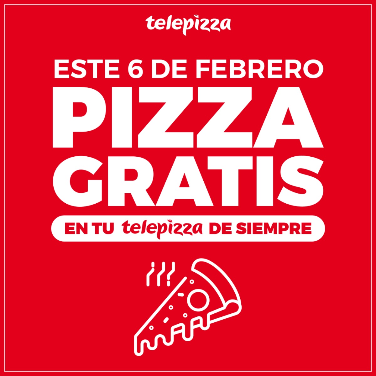 La marca repartirá pizza gratis en 400 de sus restaurantes, repartidos por toda la geografía española, aprovechando el Día de la Pizza. Telepizza aclara que se regalará máximo 1 porción por persona y que es recomendable consultar el horario de apertura de cada establecimiento.