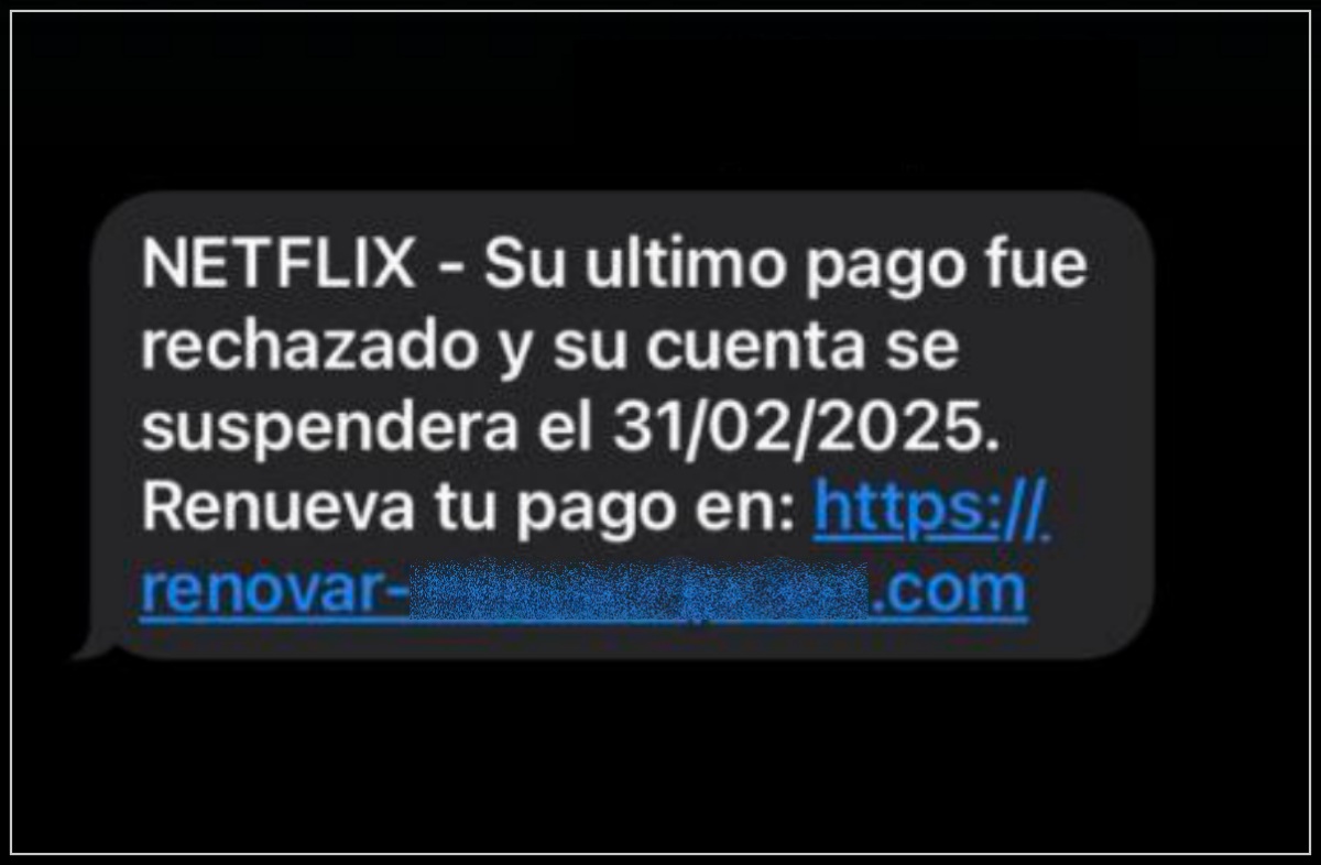 Así pues, los estafadores lanzaban de manera indiscriminada miles de mensajes de texto que llegaron a los terminales móviles de muchas personas de Albacete y del resto de España, en los que se indicaba lo siguiente: “NETFLIX – Su último pago fue rechazado y su cuenta se suspenderá el 31/01/2025. Renueva tu pago en https://renovar-XXXXXXX.com».