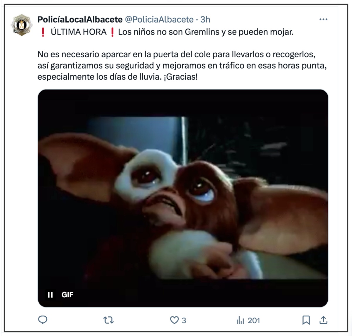 “¡Última hora!, los niños no son Gremlins y se pueden mojar”, manifiesta en su mensaje la Policía Local de Albacete, que añade que “no es necesario aparcar en la puerta del cole para llevarlos o recogerlos” y explica que “así garantizamos su seguridad y mejoramos el tráfico en esas horas punta, especialmente los días de lluvia”.