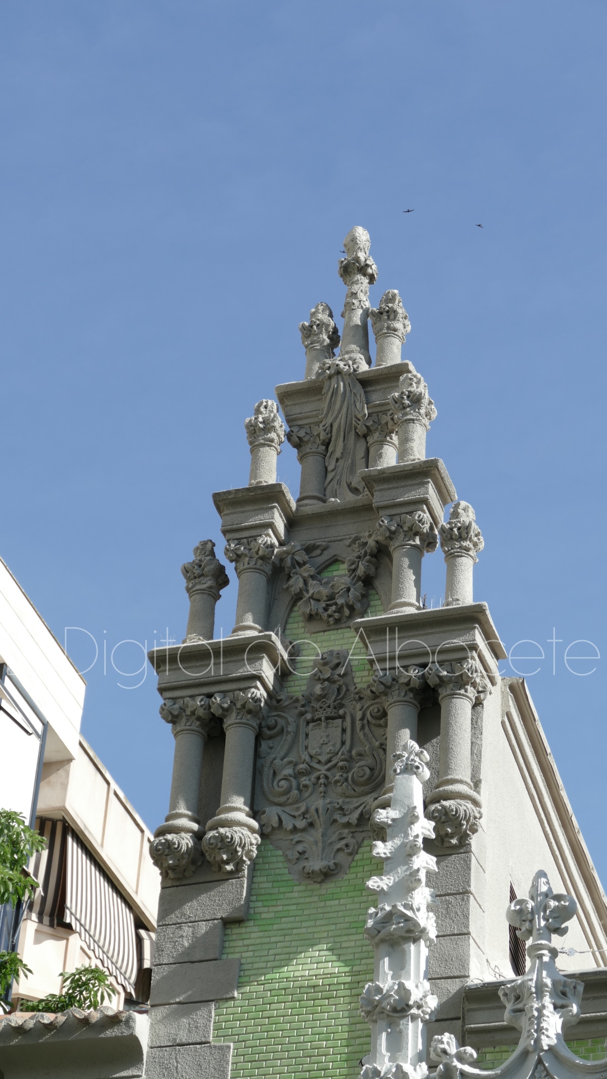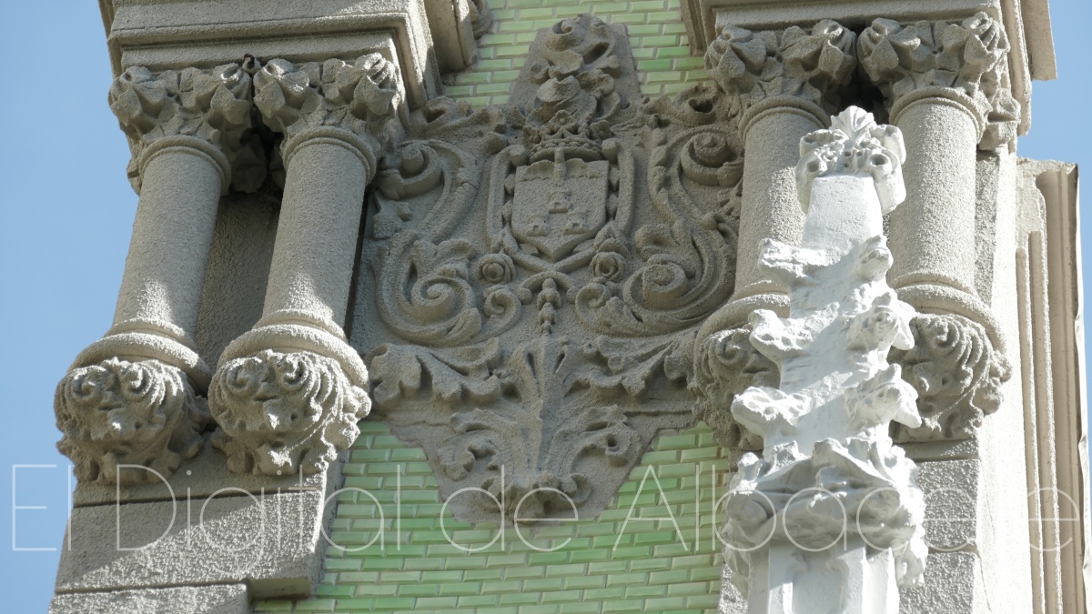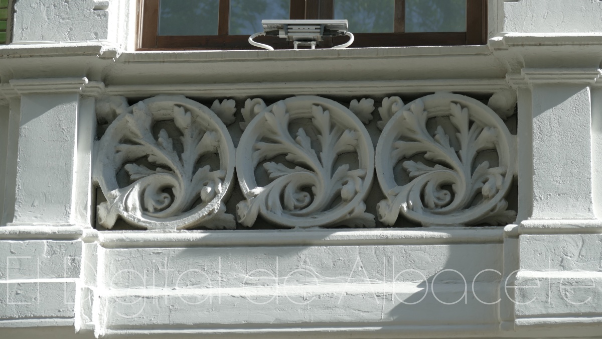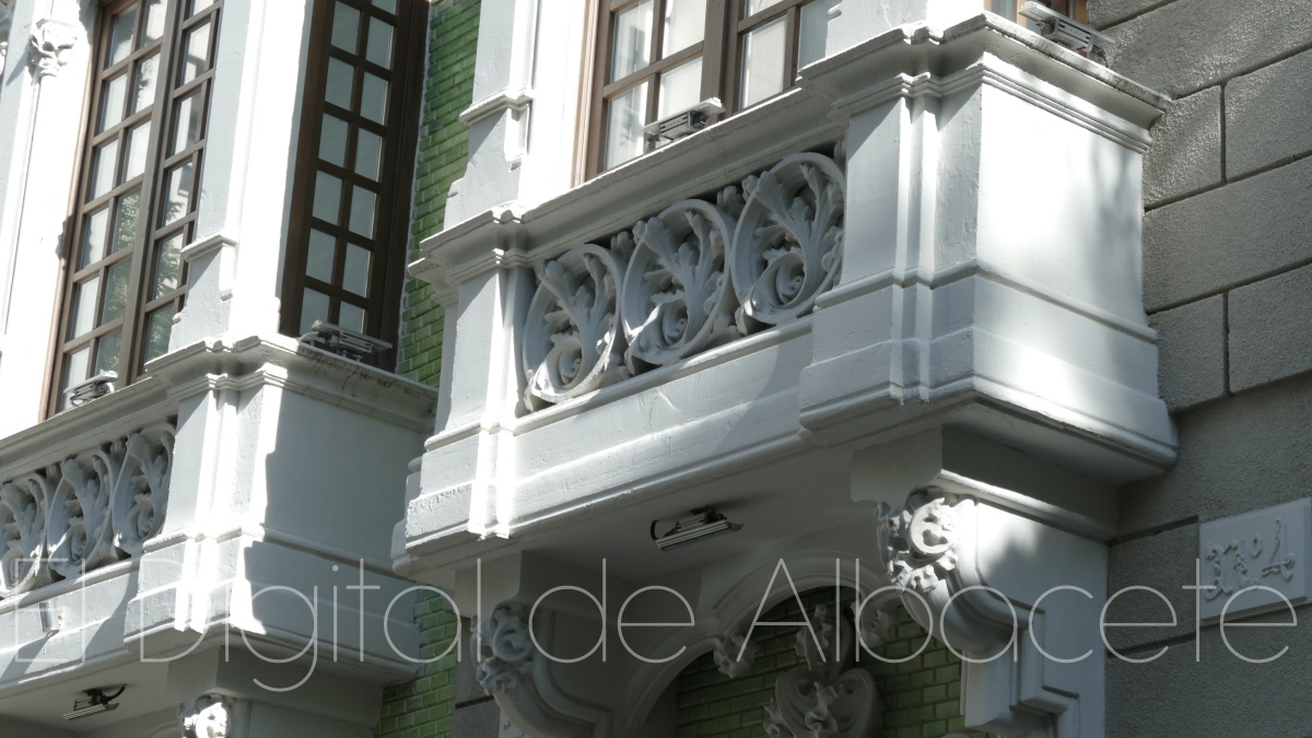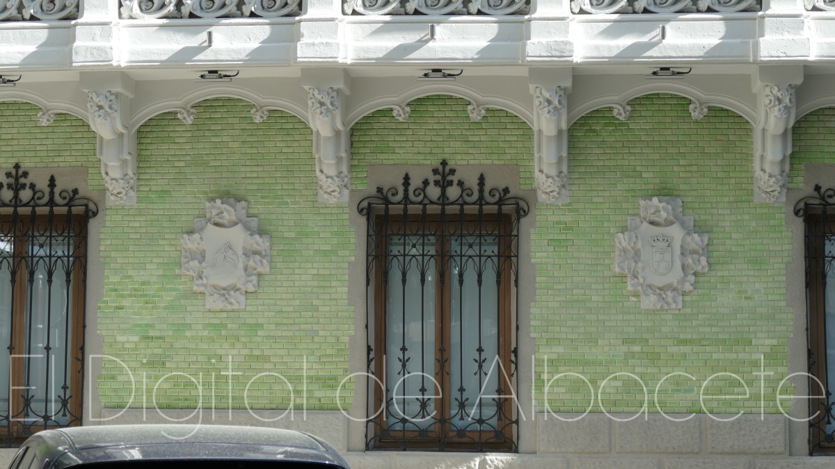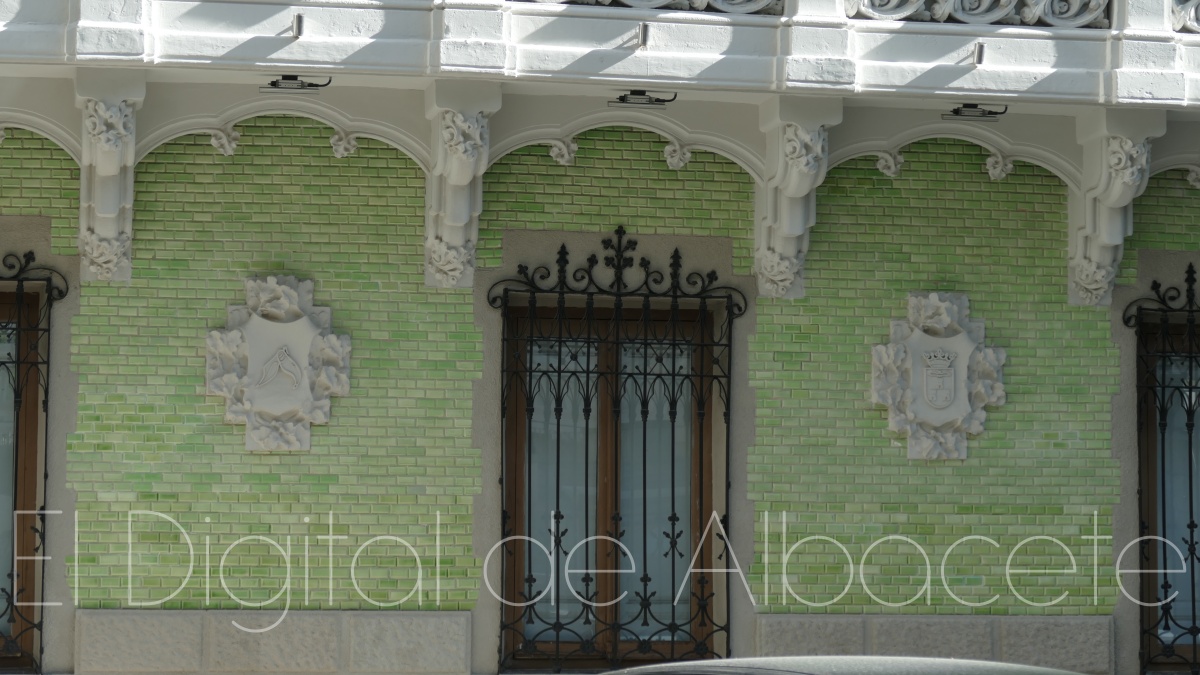 Por otro lado, la zona de la izquierda se une con “la parte central con la balconada del centro, donde también se pueden apreciar una columna que se fusiona con la fachada”, señala, y subraya el énfasis del arquitecto por “darle la importancia a la zona de la derecha del edificio”. En lo relacionado a la parte central, en su piso inferior podemos ver “un zócalo de piedras donde se integran las ventanas, y dos escudos, el de Albacete y otro protagonizado por una navaja”.