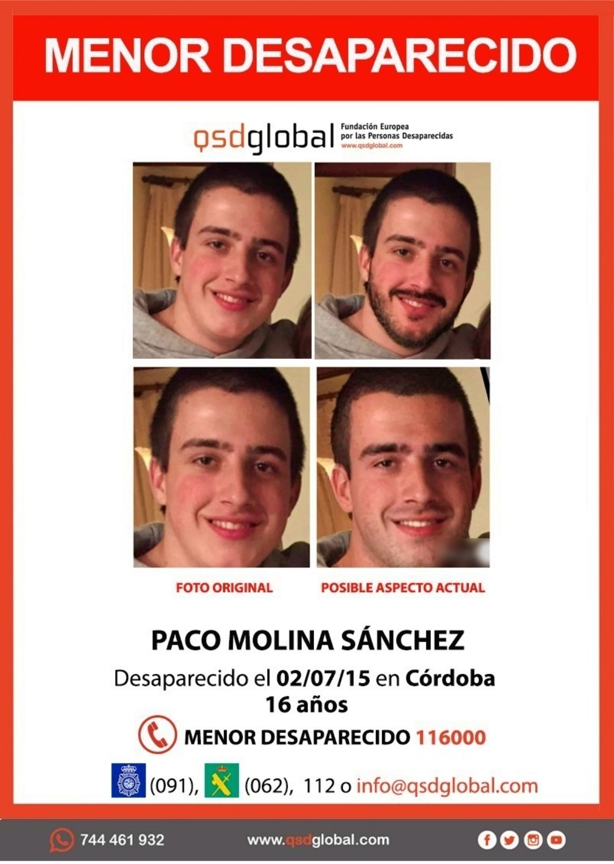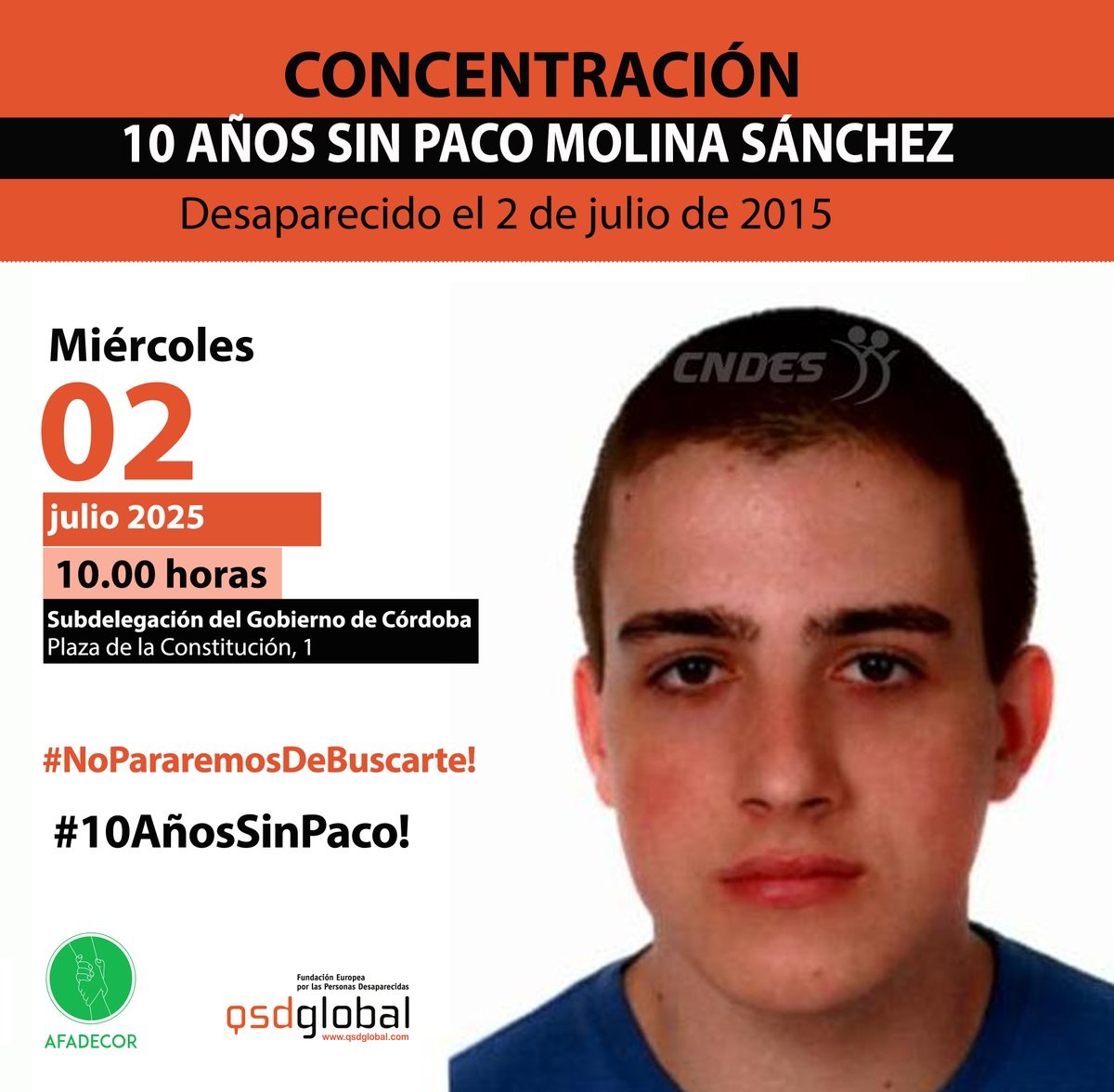 Como decimos, son ya 10 los años que hace que Paco Molina desapareció, pero su familia ni se olvida de él ni cesa en el empeño de encontrarlo. De hecho, este miércoles, día 2 de julio, fecha en la que se cumplen los diez años de su desaparición, sus allegados han convocado una concentración frente a la sede de la Subdelegación del Gobierno de España en Córdoba para dejar patente que siguen con su lucha para tratar de esclarecer qué pasó con el joven Paco aquel 2 de julio de 2015.